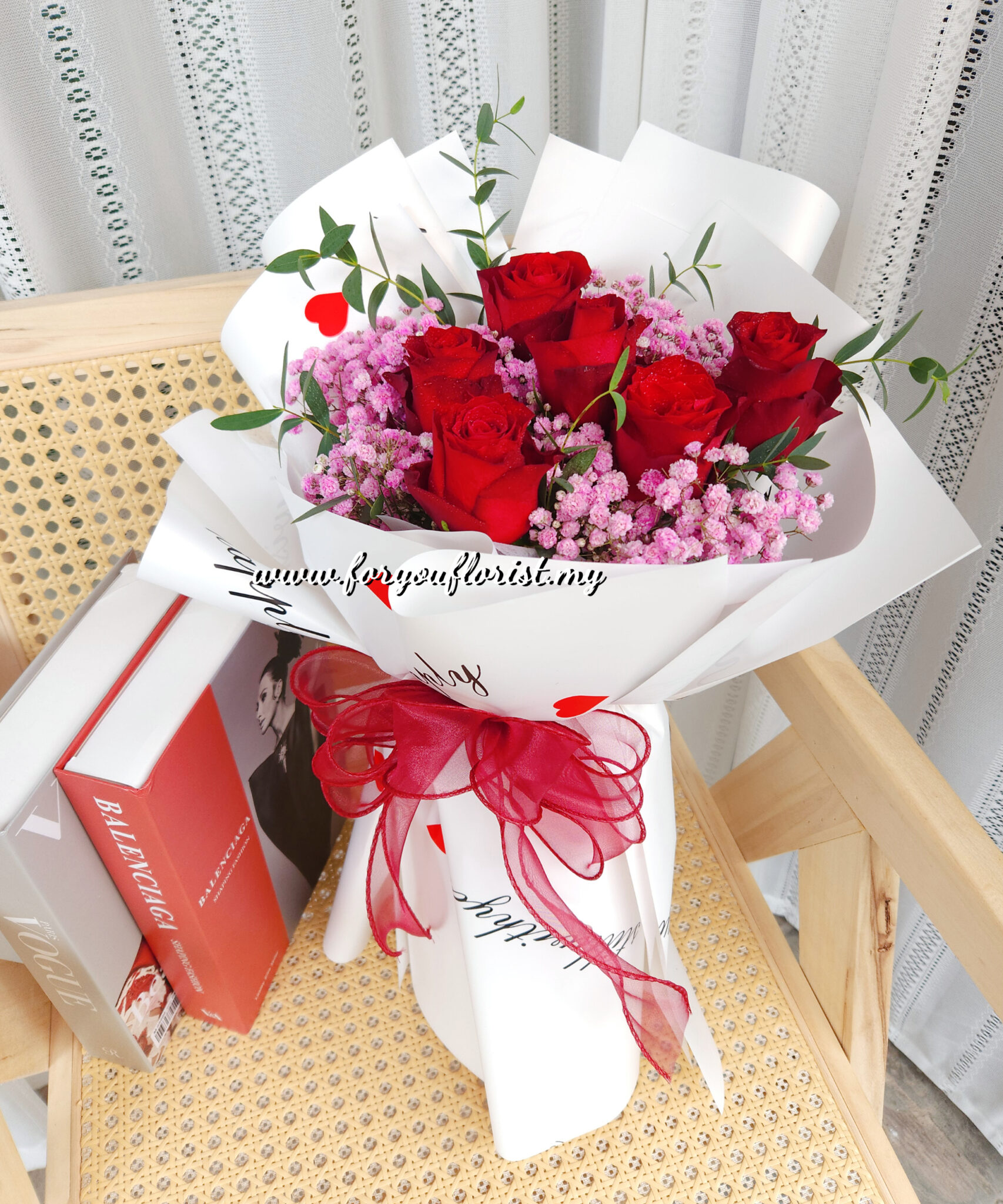 Lovely hand bouquet of 6 Red Roses with Statice small flowers.
