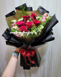Lovely hand bouquet of 6 Red Roses with decorative pink and yellow Statics.