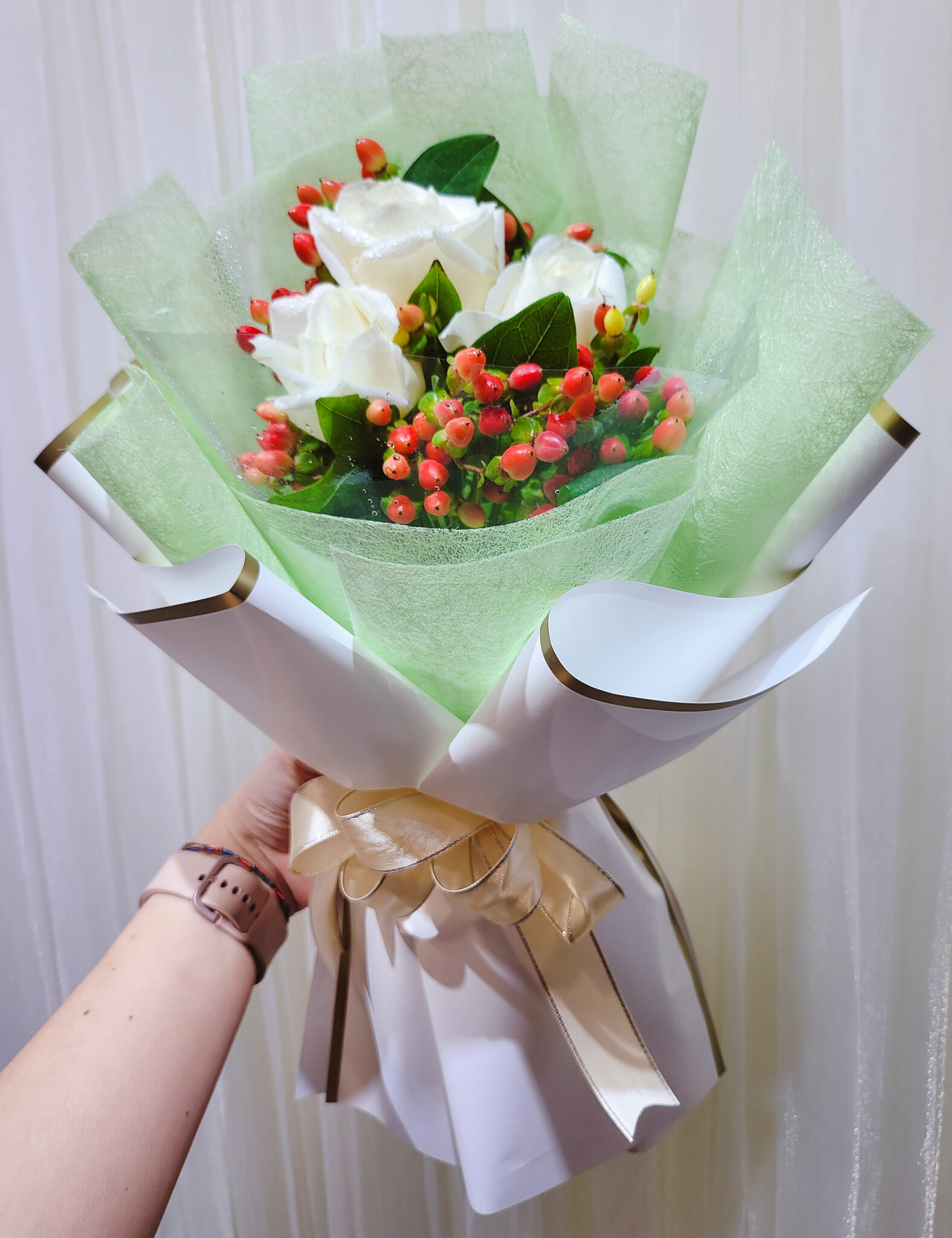A refreshingly elegant hand bouquet of 3 White Roses with Red Cherry Berries.