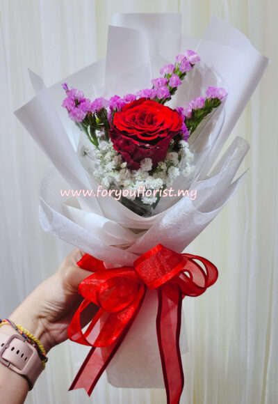 Lovely hand bouquet of 3 stunning pink roses with pink Baby Breath in elegant wrappings.
