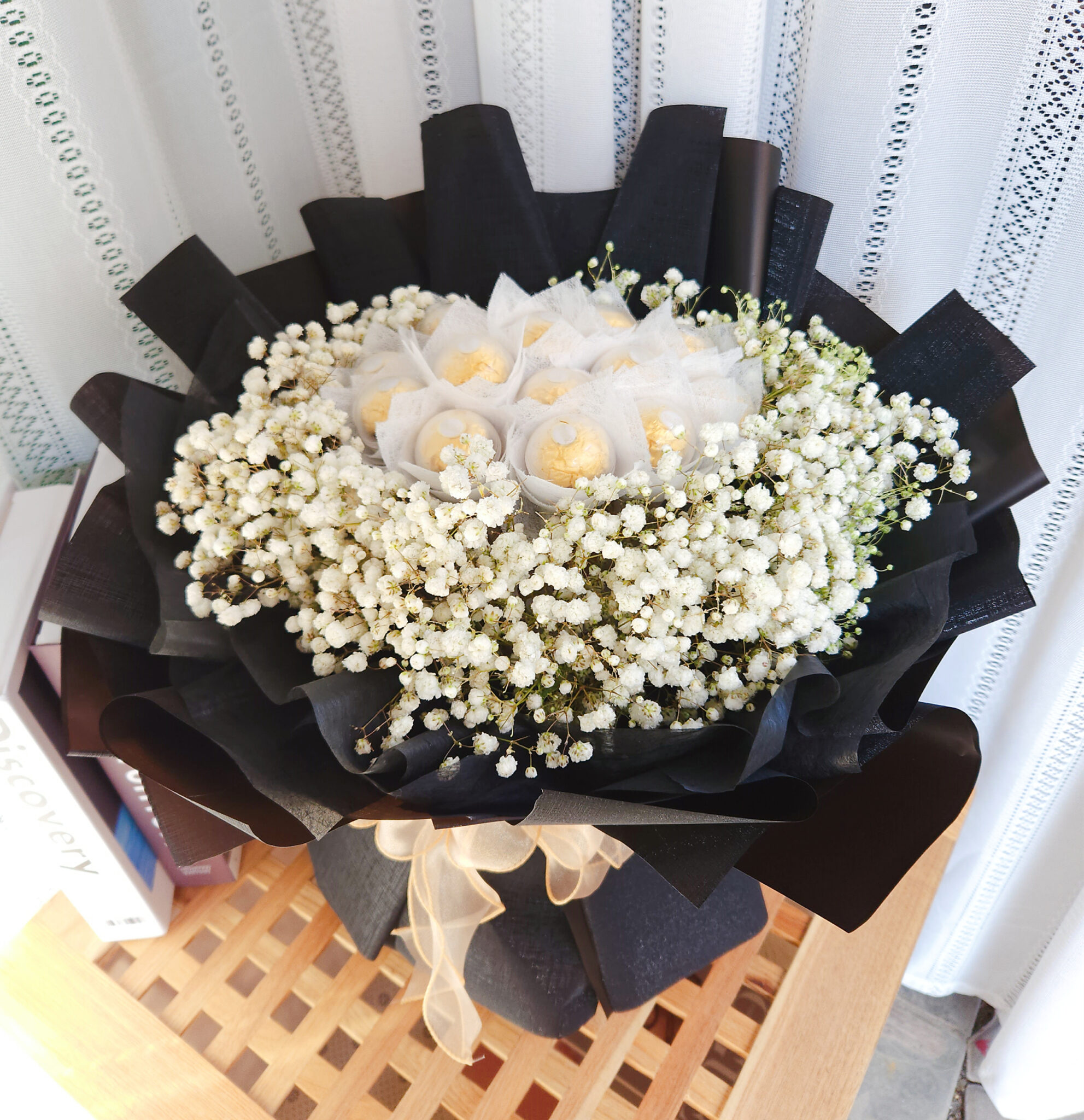 Lovely hand bouquet of 15 Ferrero Rocher chocolates with white Baby Breath.