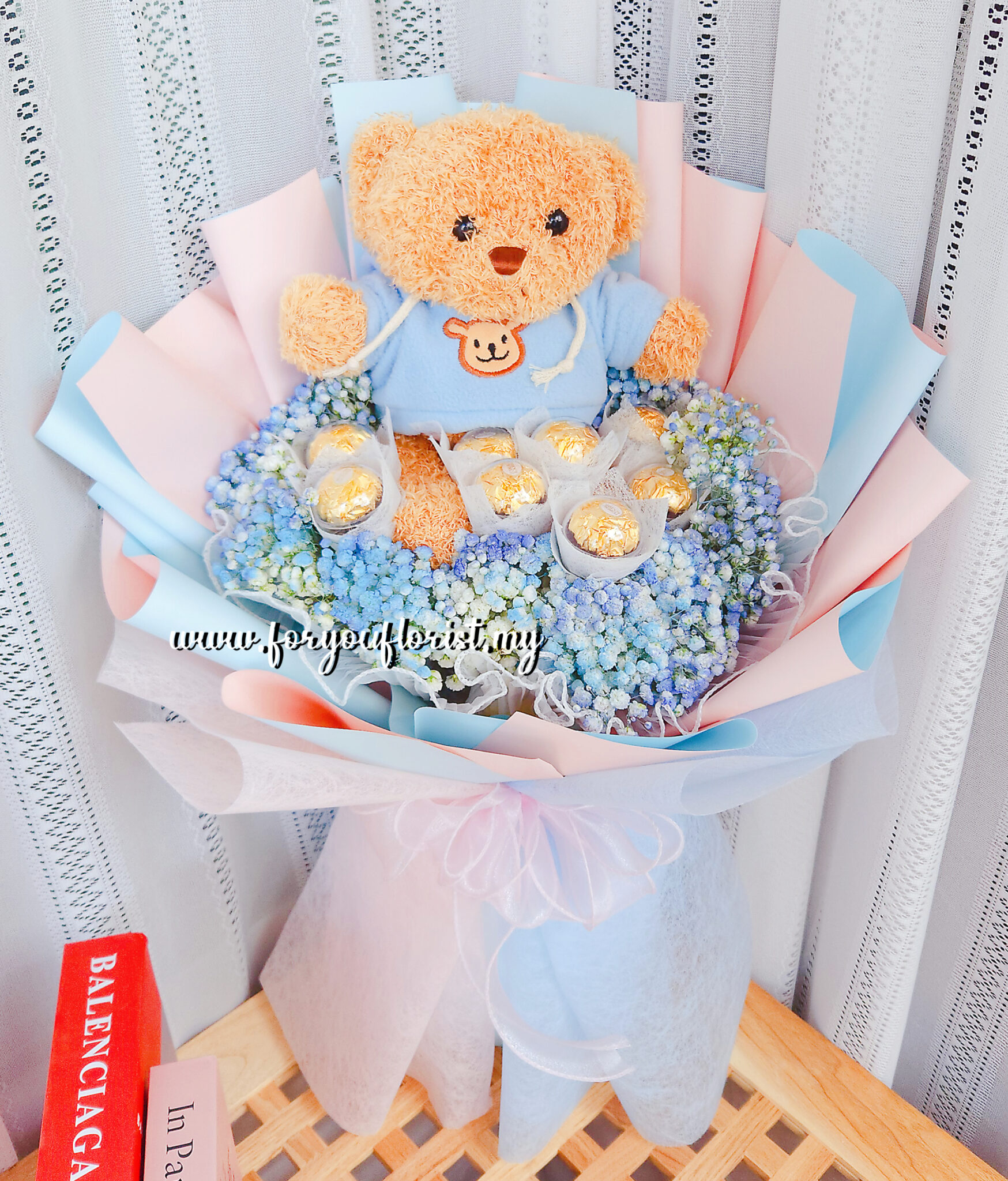 An exquisitely wrapped hand bouquet of 8 Ferrero Rocher chocolates surrounded with romantic Baby Breath, with a teddy bear.