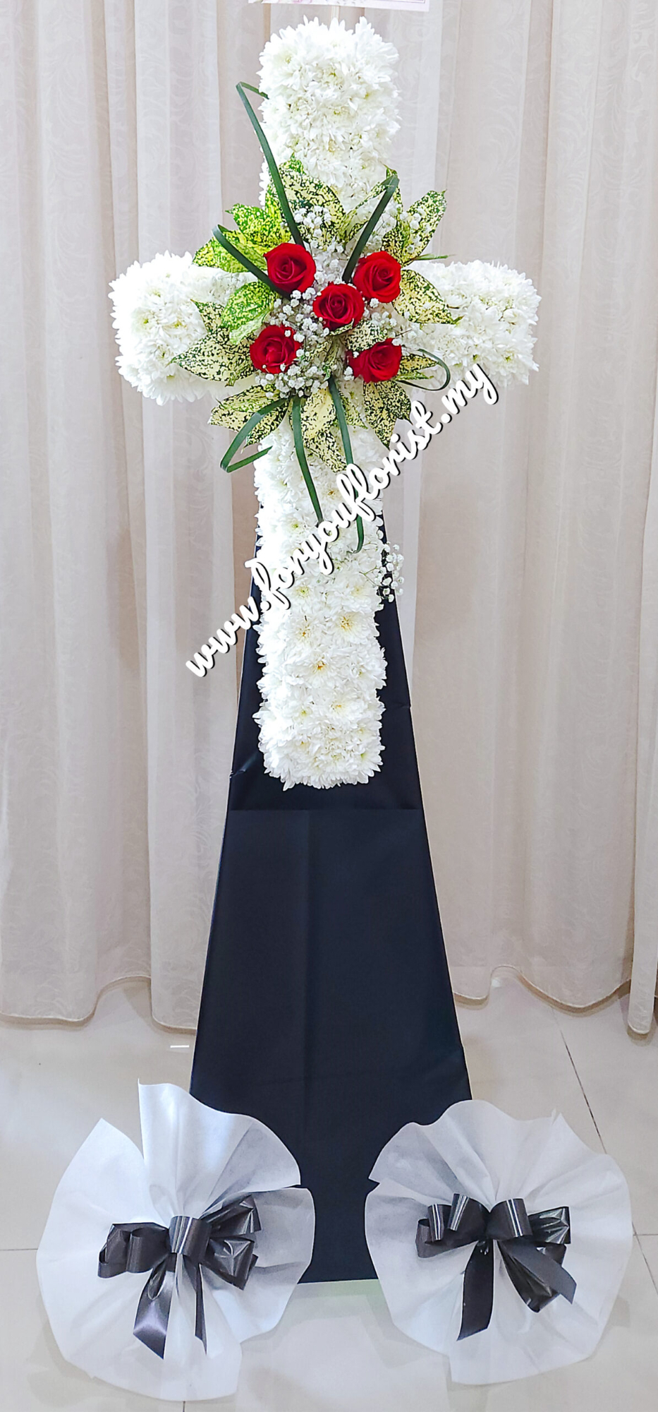 This peaceful Condolence Cross in white PomPoms, Red Roses and Greens is a gracious expression of sympathy and deepest condolence at any funeral or wake.