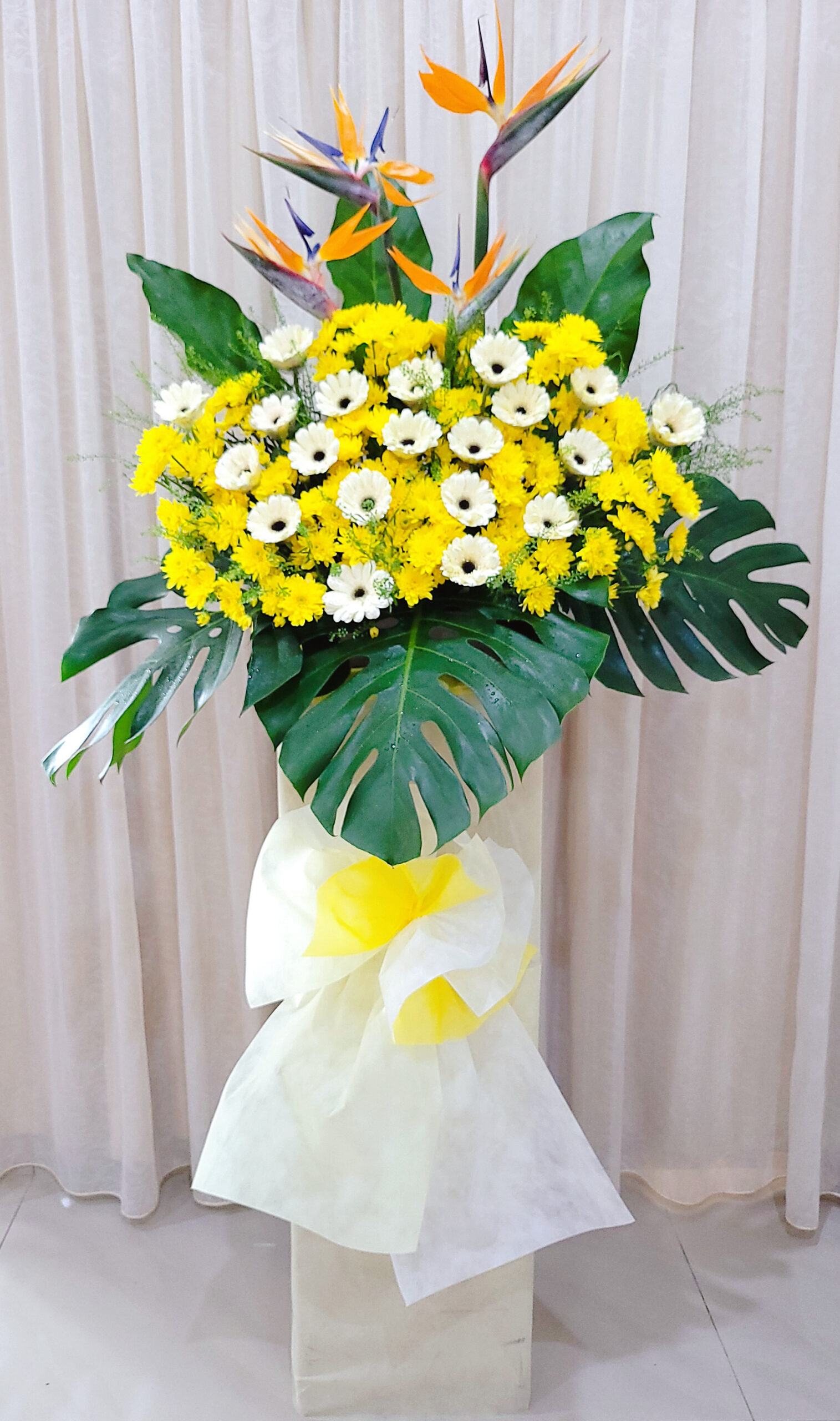 Featuring premium condolence stand of of Bird Paradise, white Daisies, yellow PomPoms, white Peacocks, decorating small flowers and greens, is a graceful expression of heartfelt sympathy and deepest condolence at any funeral or wake.