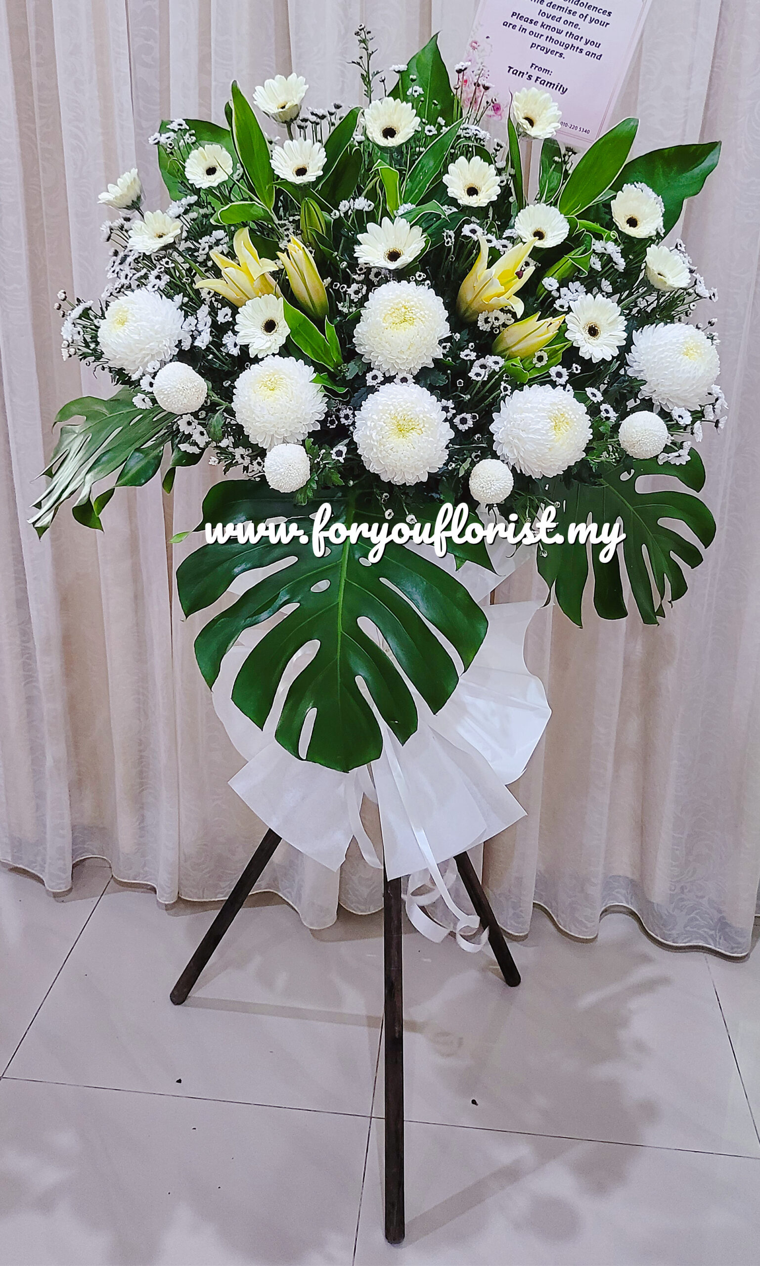 This peaceful three tier condolence stand in cheerful Sunflowers, white Chrysanthemum, Pompoms and Greens is a gracious expression of sympathy and deepest condolence at any funeral or wake.