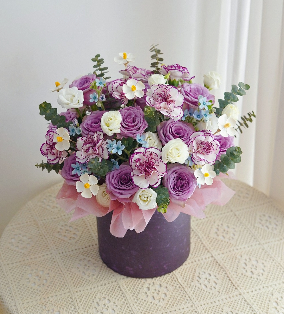 Lovely flower box of 12 purple Roses with Blue Star, white Eustoma, purple carnations, Eucalyptus and soap rose Violet.