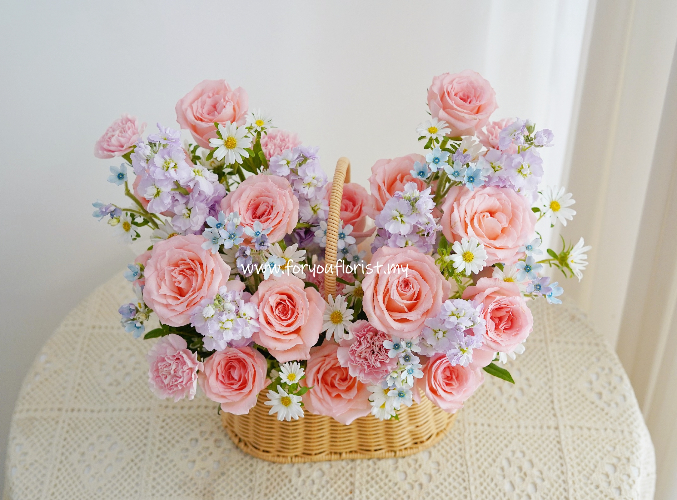 Lovely flower box of 10 purple roses, pink carnations, pink carnation spray, white Eustoma and 2 helium love balloon. Need preorder 2 days advance.