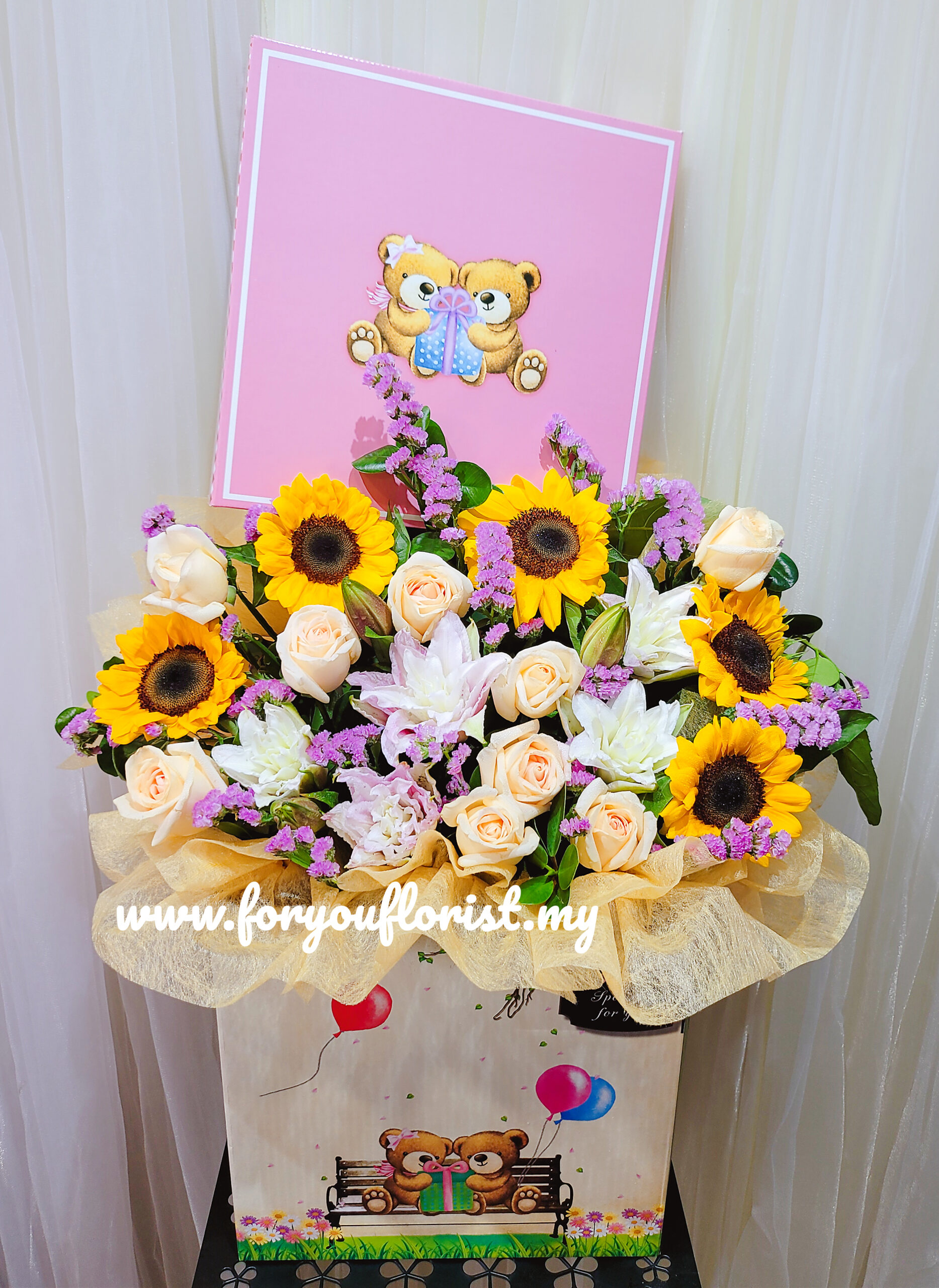Delightful large flower box of premium Casa Lilies, champagne Roses, bright Sunflowers, pink Statics and Greens in large box of appriximate size 31cm x 31cm x 31cm.