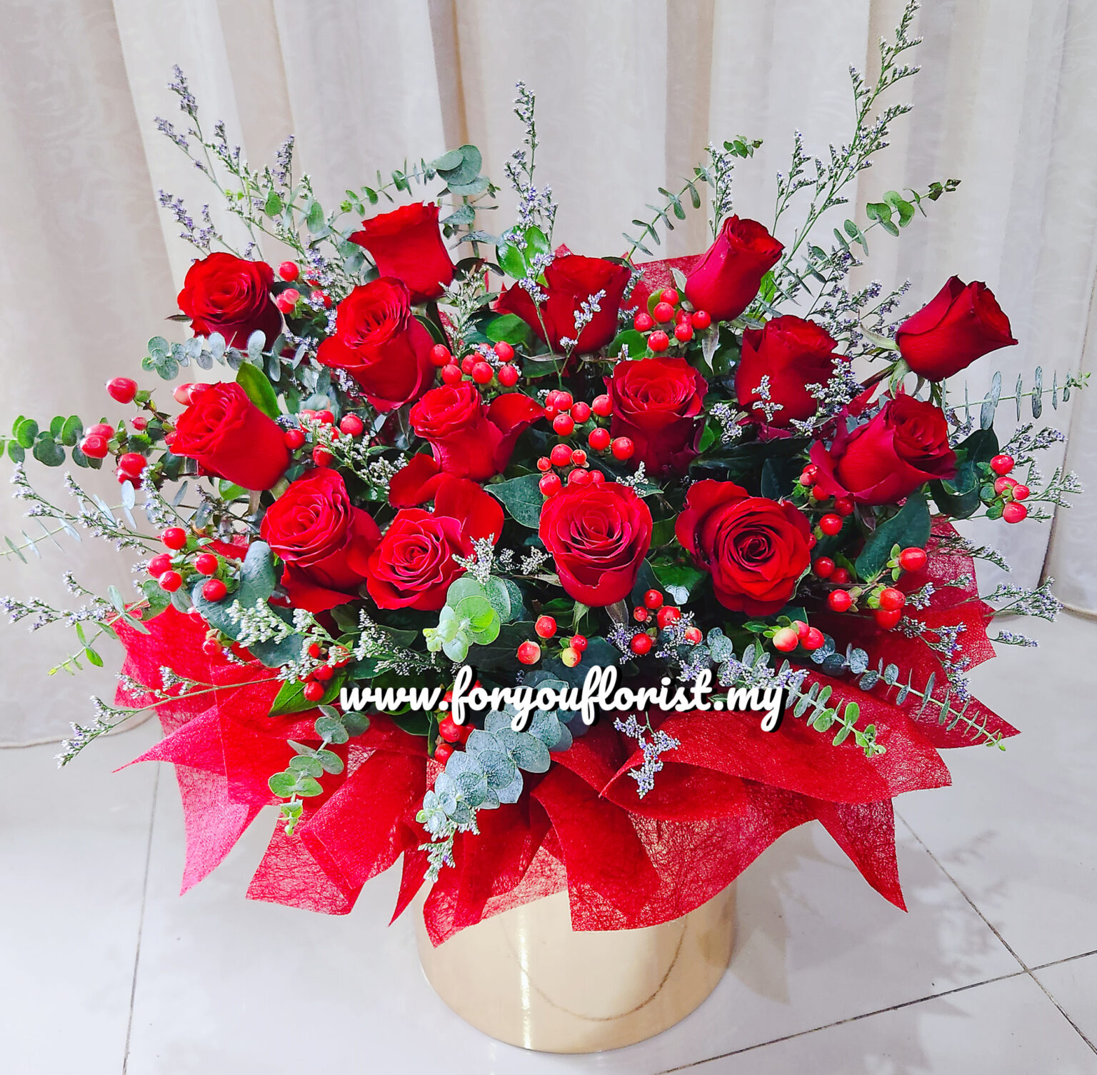 Outstanding flower box of premium Red Roses with Eucalyptus , Red Berries, Caspias with custom made wording balloon.