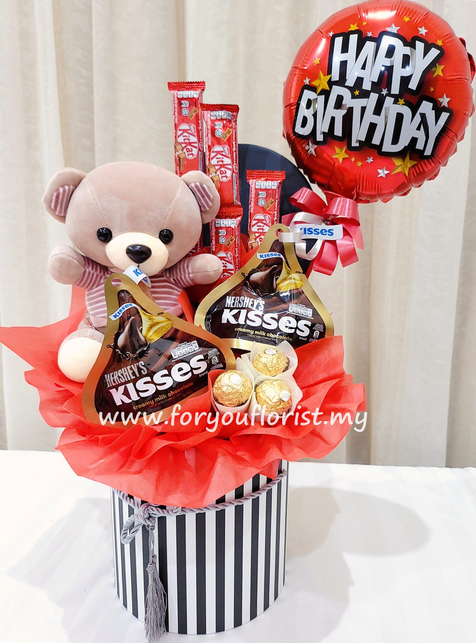 Chocolate variety box with Teddy bear and 10 inch birthday/love balloon. Box design subject to change due to availability.