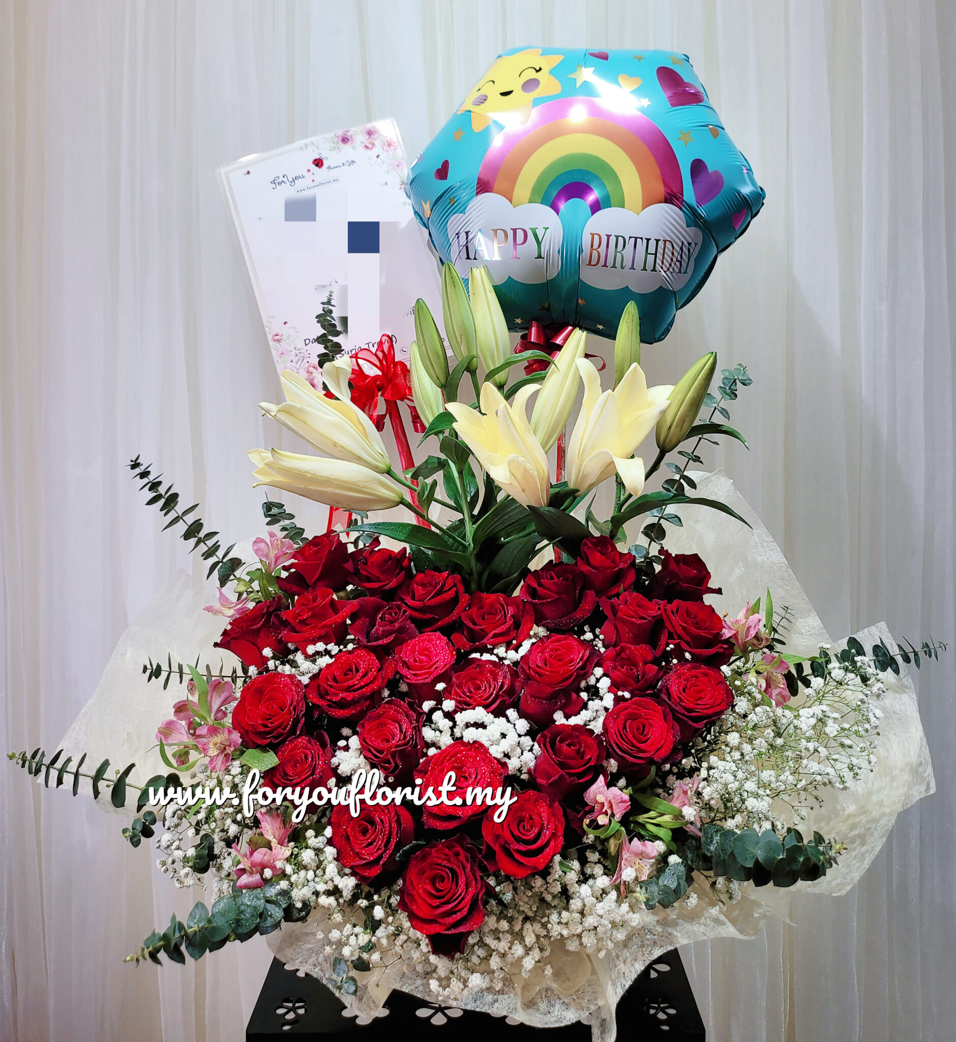 Big impressive flower basket of vast of Red Roses, premium Lilies, with Greens and Baby Breath.