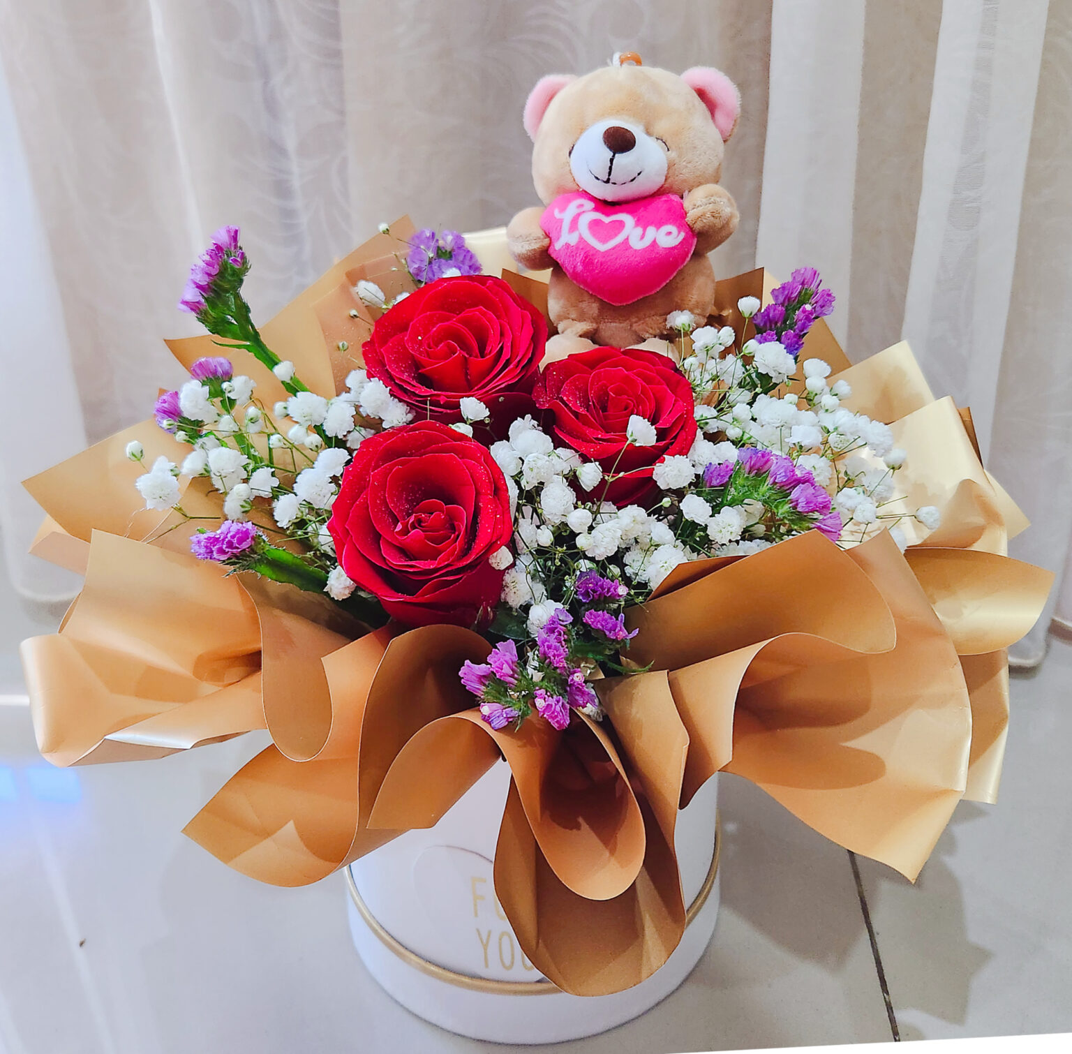 Lovely flower box of 3 Red Roses with Baby Breath and Static with an approximate height 4 inch teddy bear.