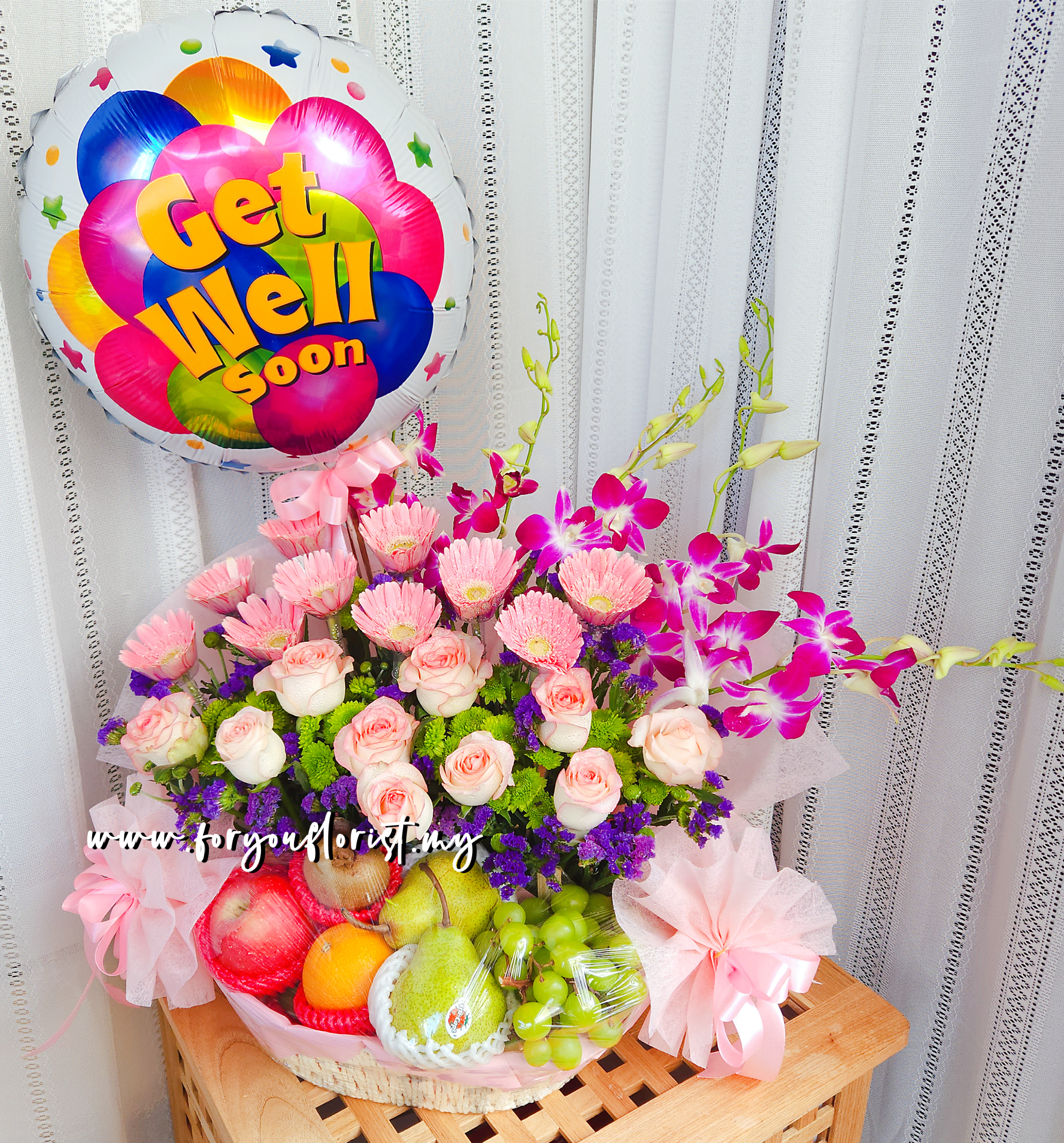 Lovely big varieties fruit basket with orchids, pink roses, Daisies and small flowers, with an 18 inch foil balloon.