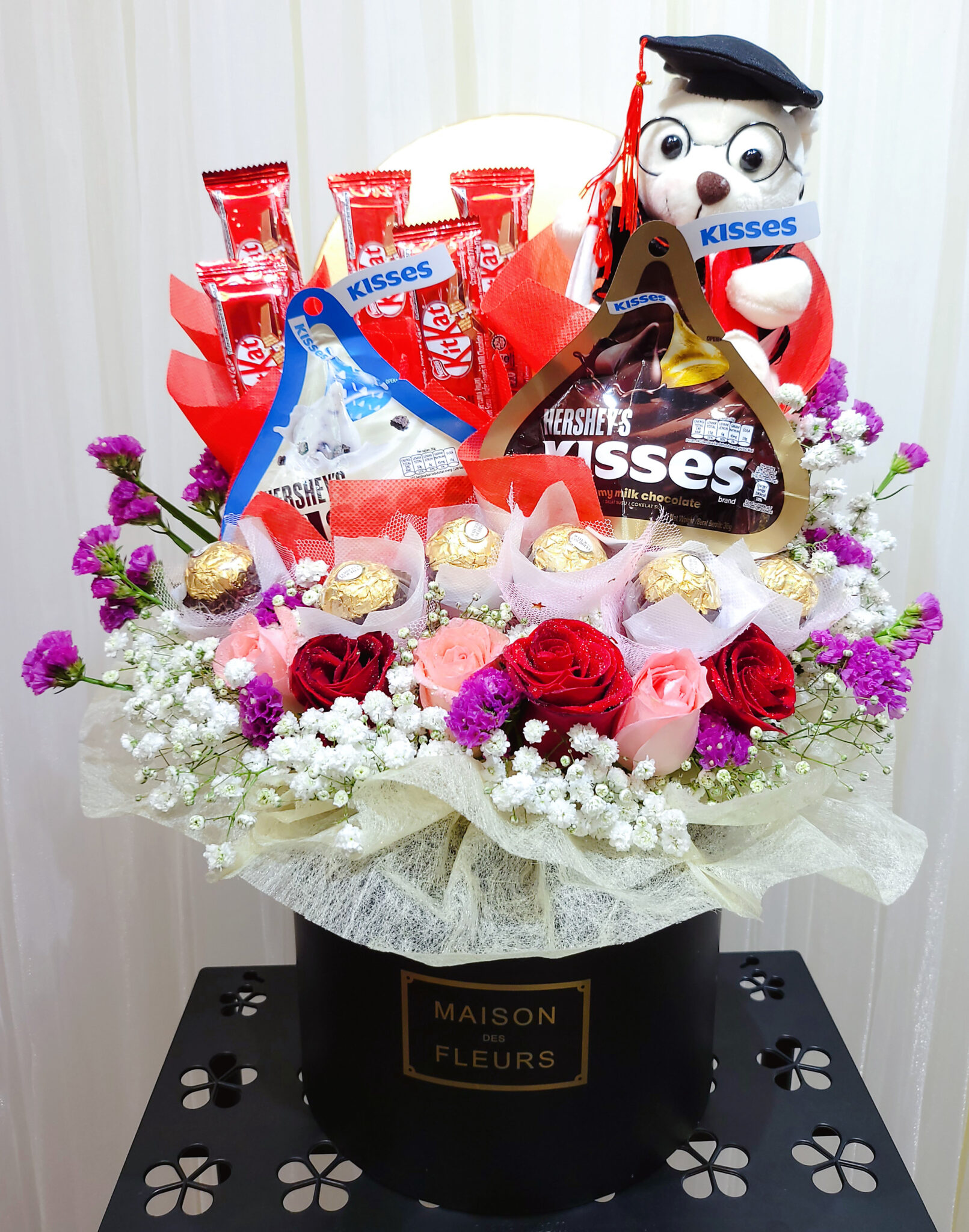 Nice big flower box of Chocolates Kisses, Ferrero Rocher and Kitkats with Roses pink and Red with surrounding Baby Breath and Statice.