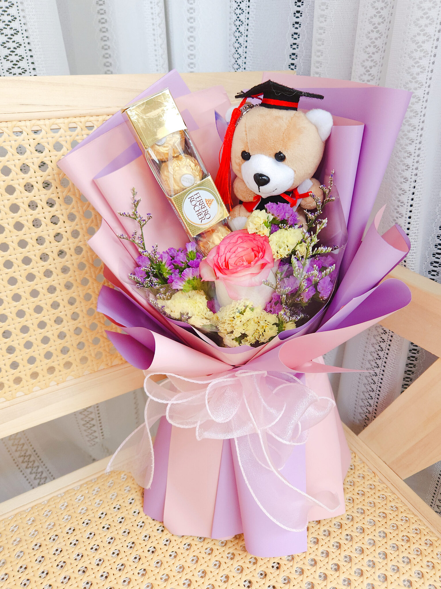 Lovely hand bouquet of 1 small graduation bear with 1 box T5 Ferrero Rocher chocolates, single pink roses with small flower fillers Caspia and Static.