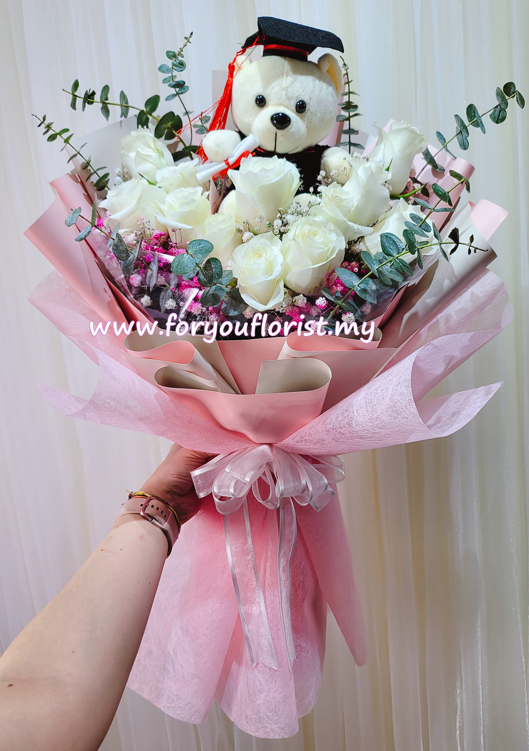 Lovely graduation bouquet of 11 White Roses with pink Baby Breath and Eucalyptus with 1 big graduation bears.