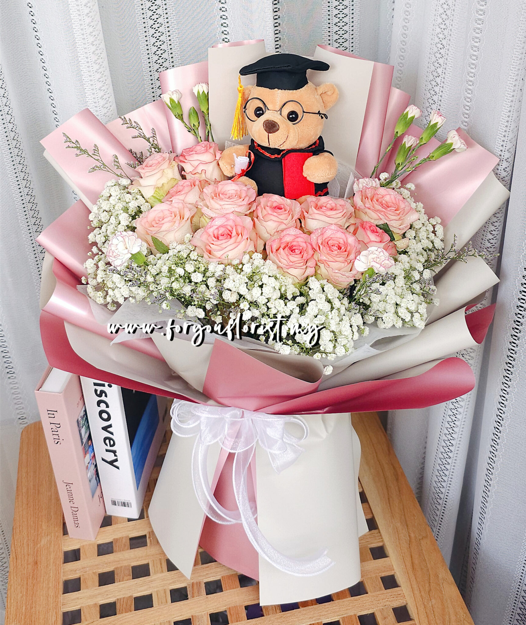 Lovely graduation bouquet of 12 stunning Pink Roses with Baby Breath in nice wrapping, accompanied with approximate 8 inches height graduation bear.