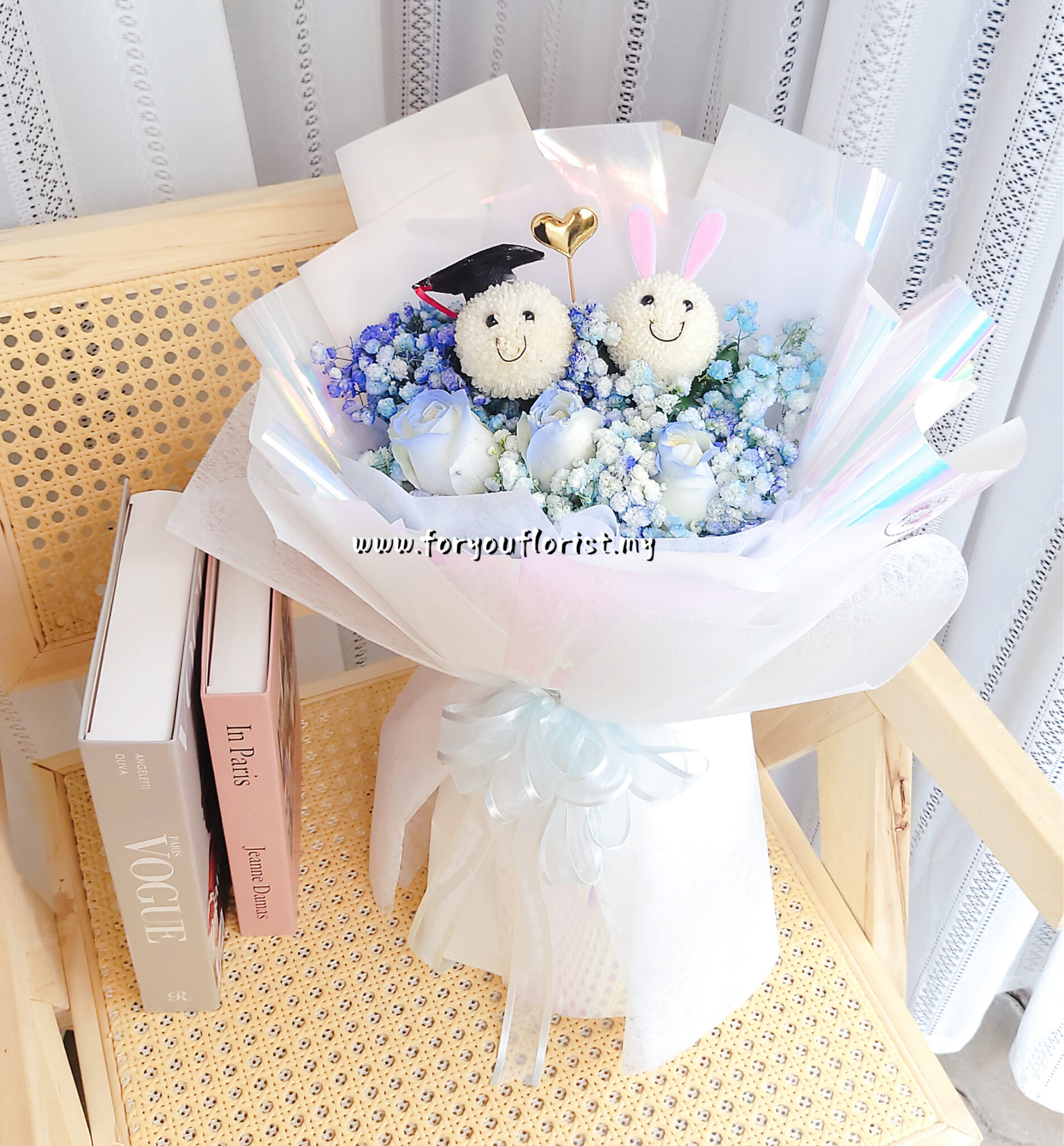 Lovely graduation hand bouquet of blue Baby Breath and 3 Blue Roses with 2 Graduation Pimpom.