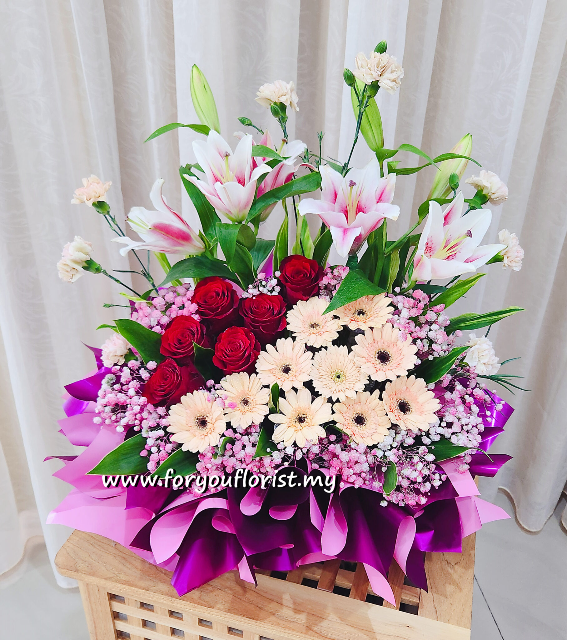 Big table flower arrangement of Lilies, Roses, Daisies, Carnation Spray, Green, Baby Breath and etc.