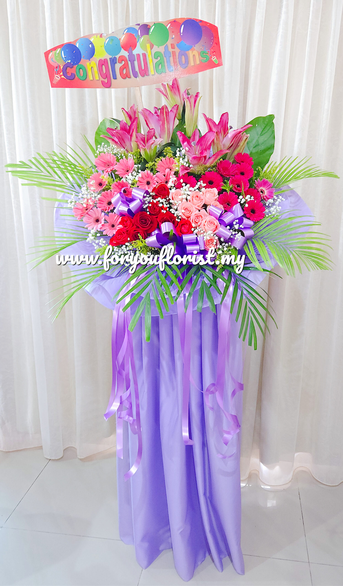 Grand congratulatory flower stand of premium Lilies, Red and Pink Roses, pink Daisies, Baby Breath, decorative PomPoms and Greens.