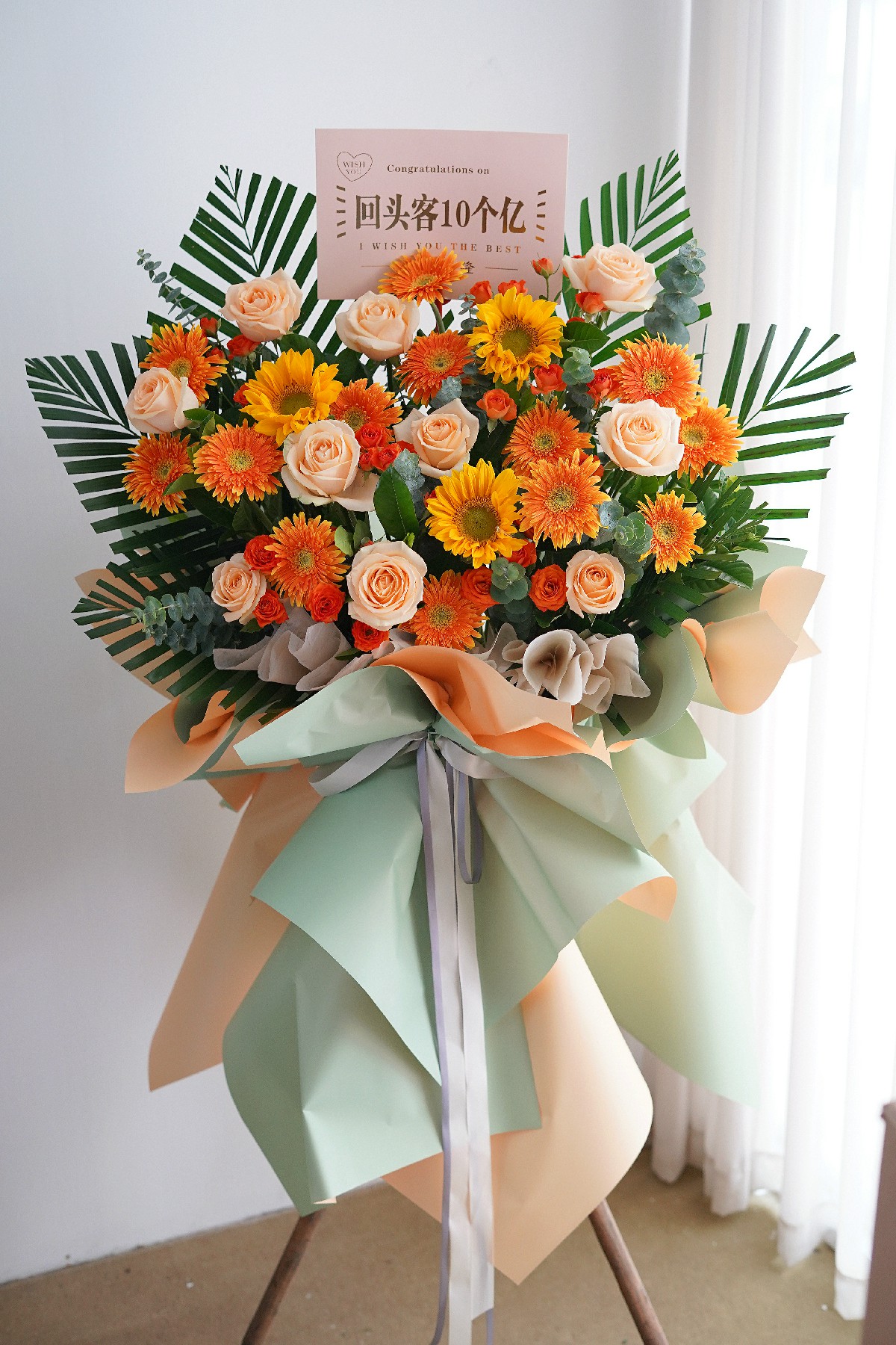Flower stand with Red roses, Orchids, Iron leaves, and etc.