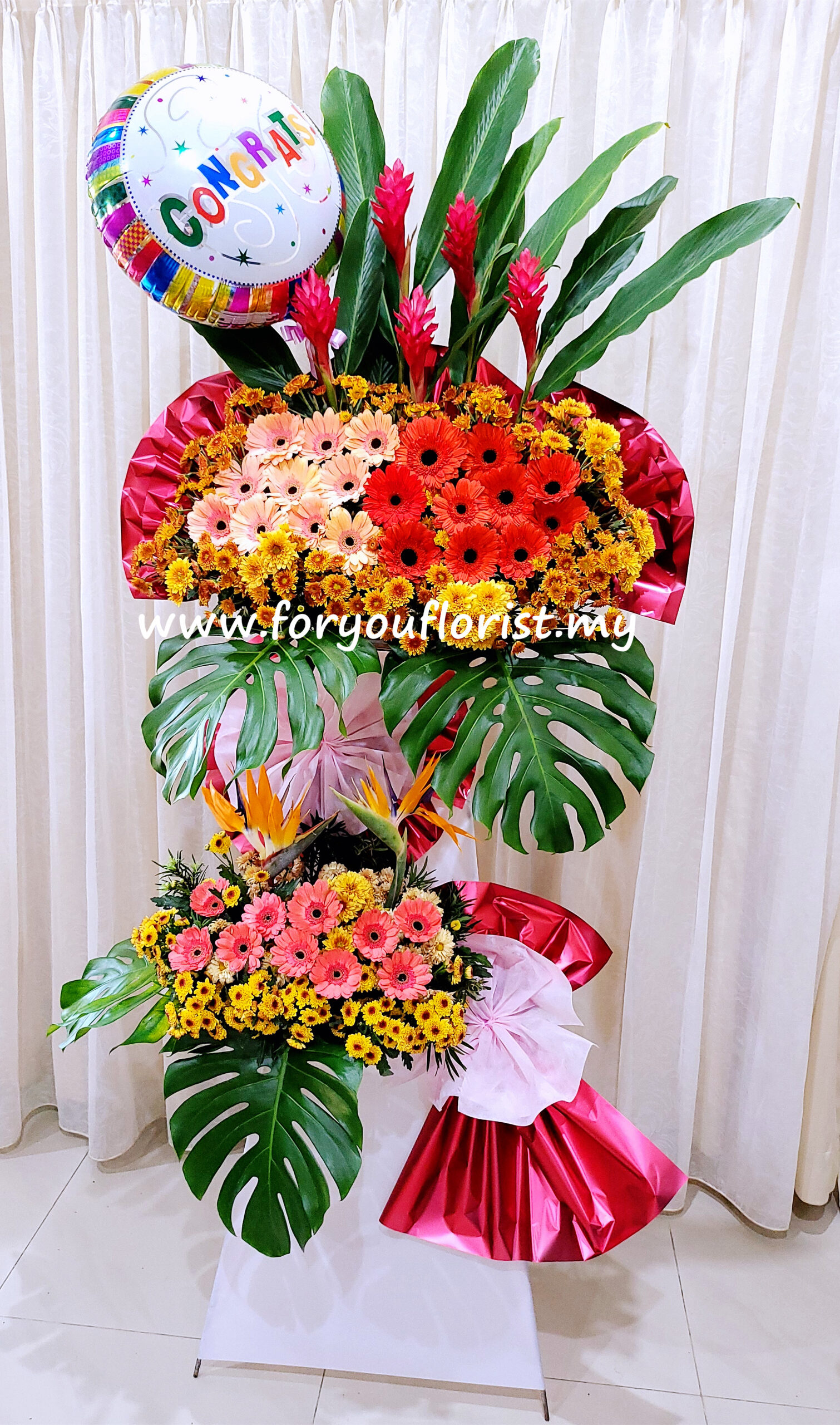 Outstanding big flower stand of orange Banana flowers, Daisies of dark pink. light pink and champagne, Bird Paradise, yellow PomPoms and Greens in pink and purple theme, added with a Congratulations foil balloon.