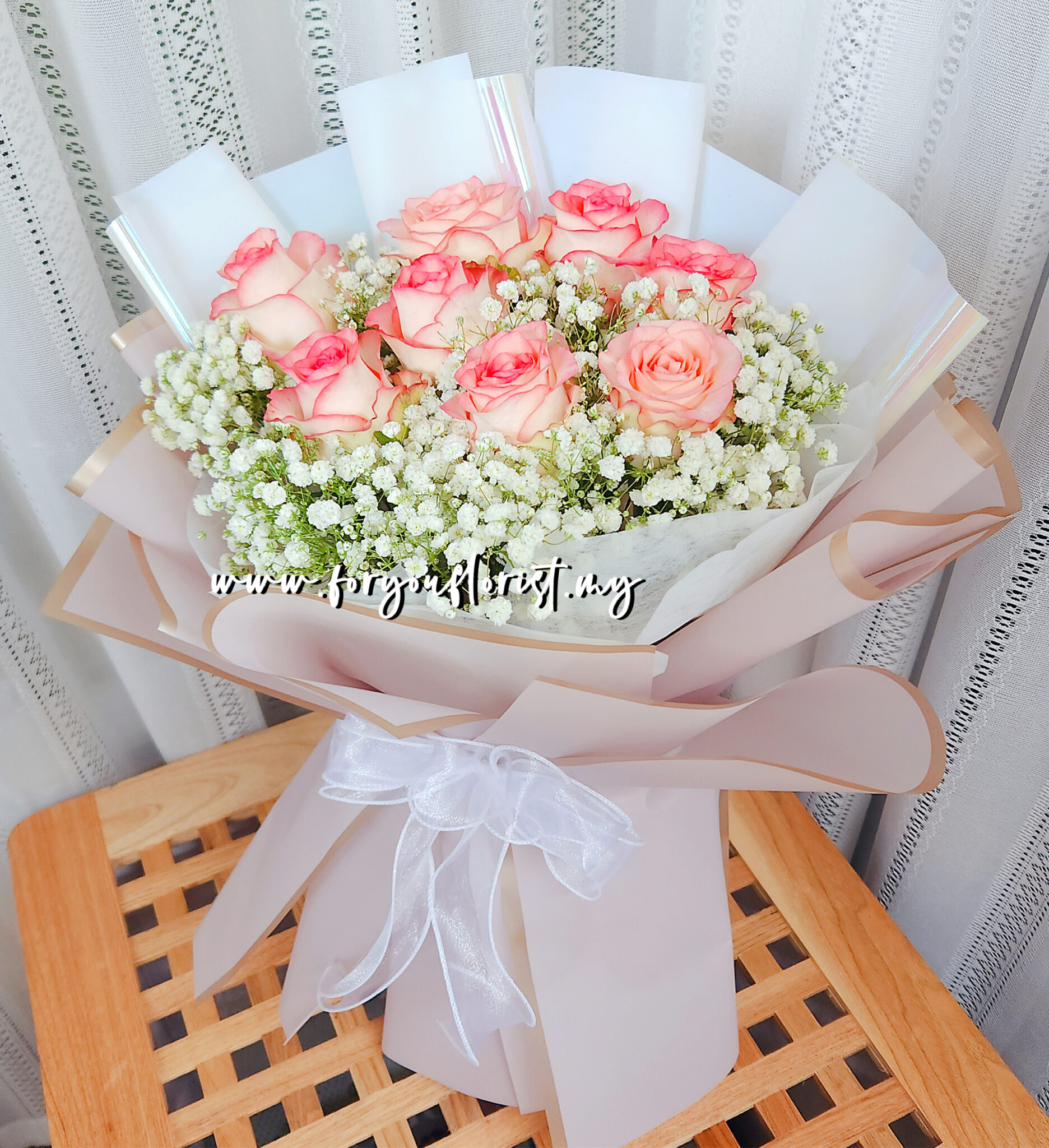 Lovely hand bouquet of 8 pink Roses with premium Baby Breath.