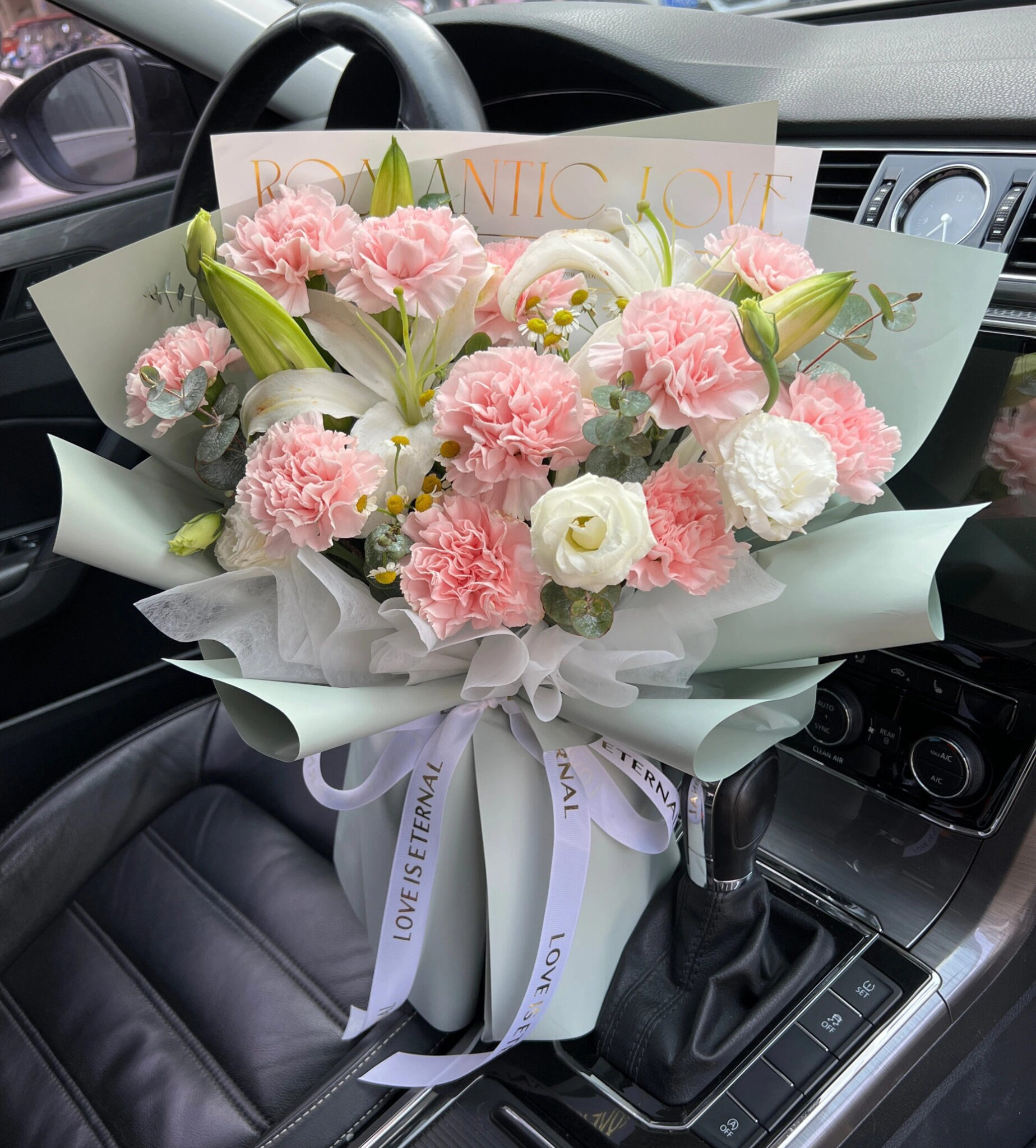 Lovely hand bouquet of 11 Carnations with Eustoma & Eucalyptus in white wrapping.