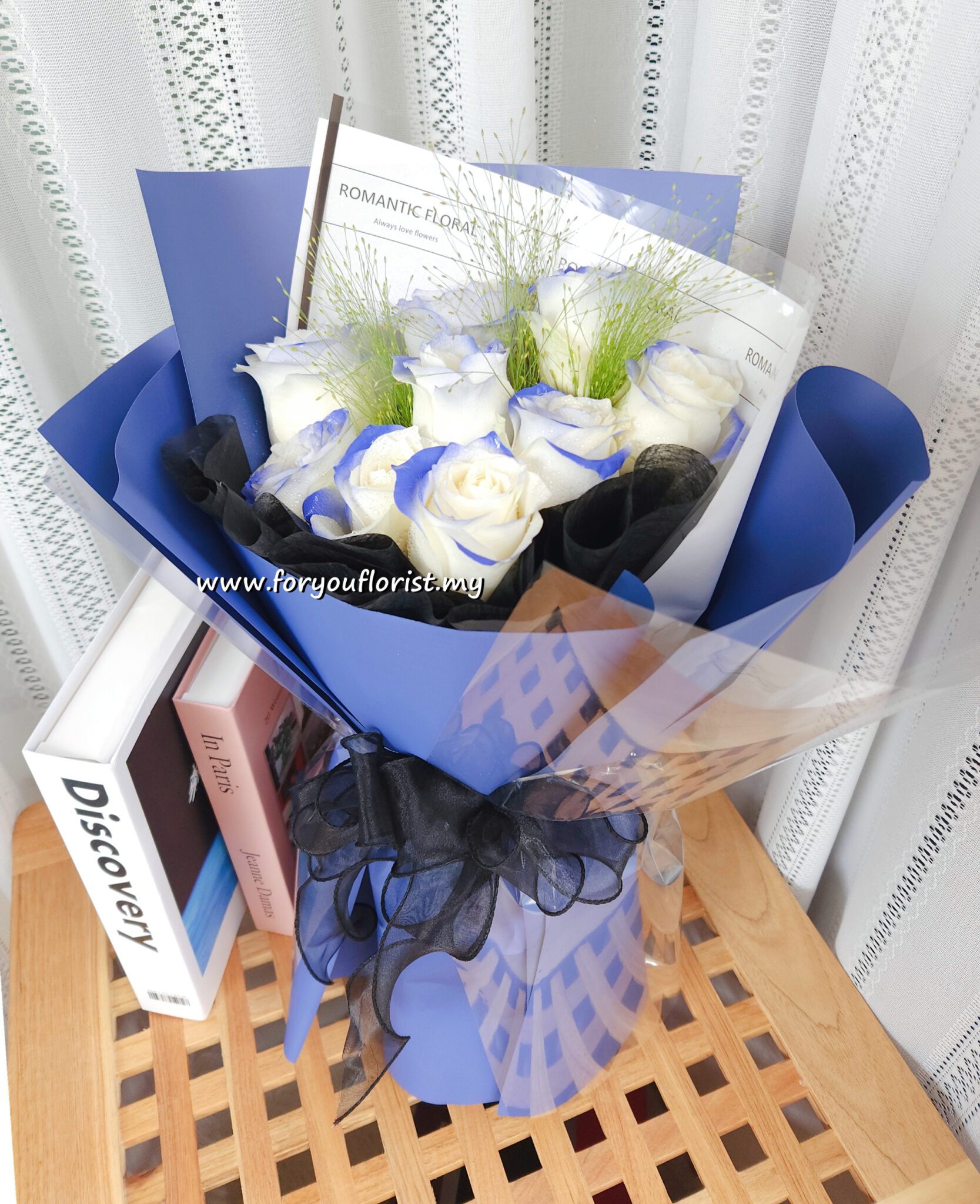 Lovely hand bouquet of 10 Blue Roses with imported fillers.