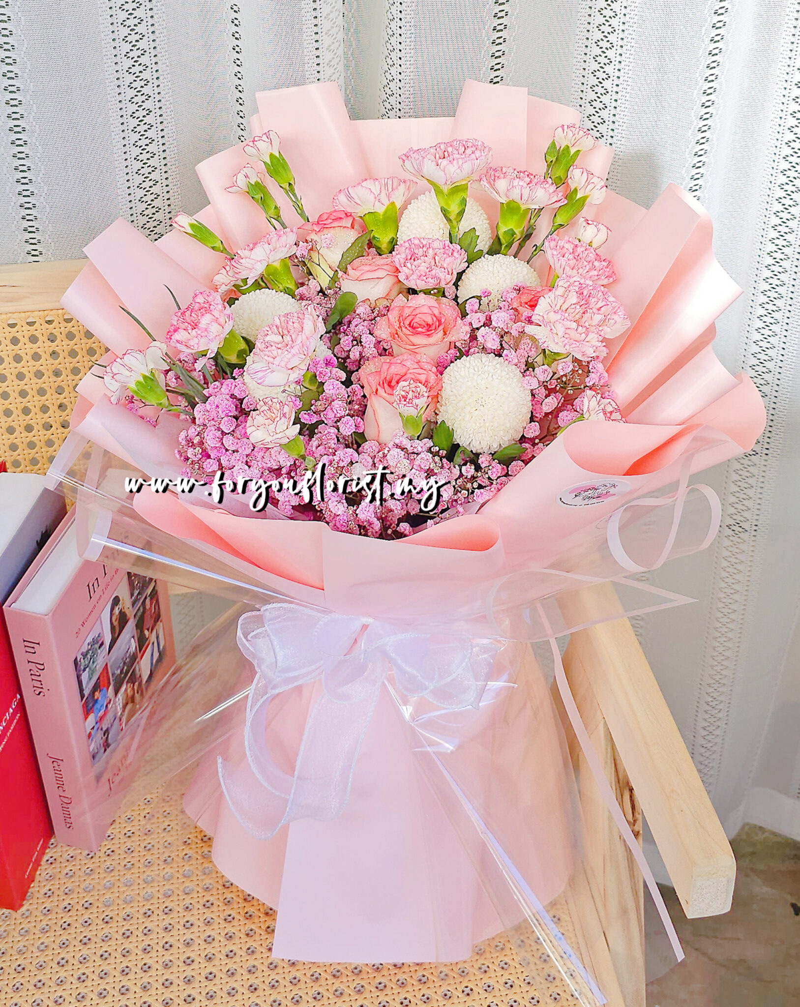 Lovely big hand bouquet of premium 4 Pink roses, 4 White Pimpom, 8 pink Carnations with Carnation Sprays and pink Baby Breath.