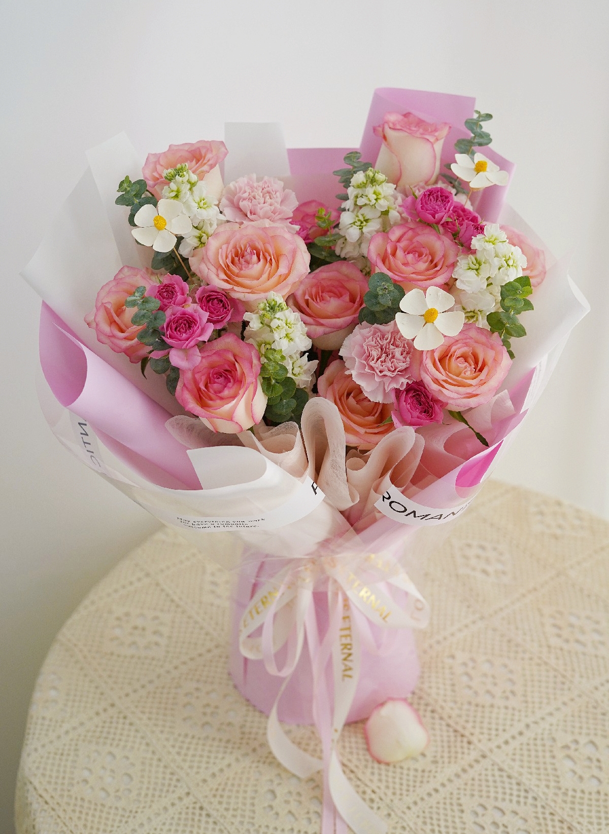 Lovely hand bouquet of 9 Pink roses, Mathiola white, Carnation, Rose Spray, Eucalyptus and soap rose fillers.
