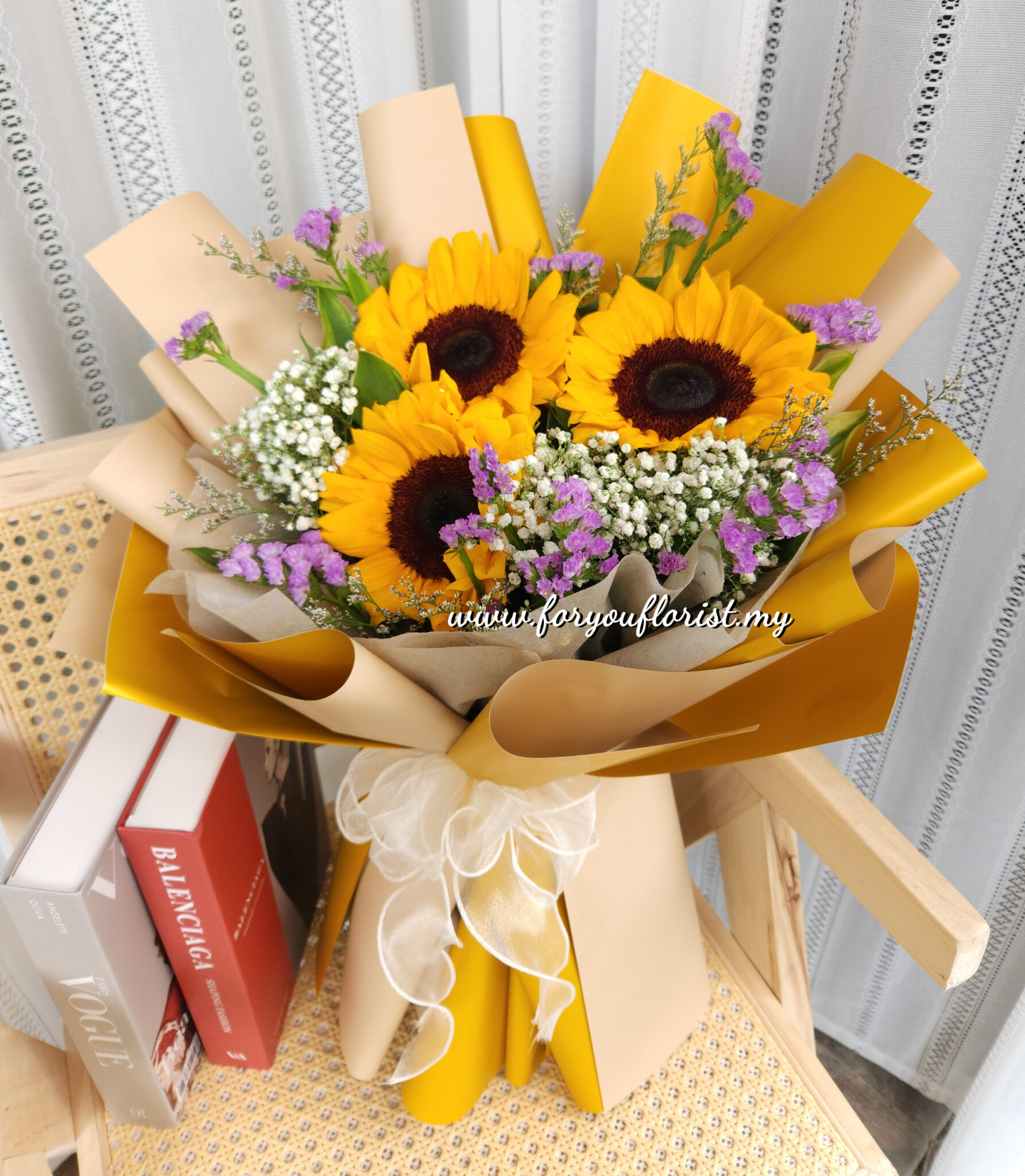 A vibrant hand bouquet of 3 bright Sunflower with decorative Yellow Peacocks and Baby Breath.