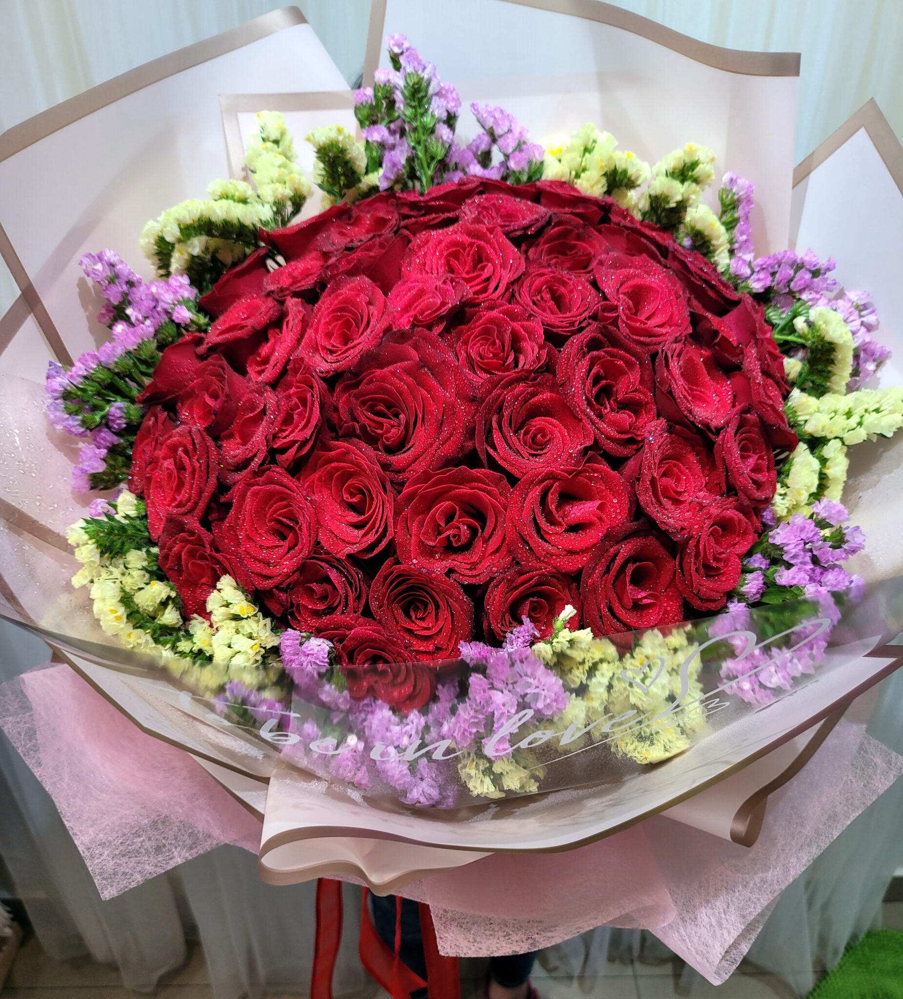 Lovely hand bouquet of 50 Red Roses with pink and yellow Statice in pink wrapping.