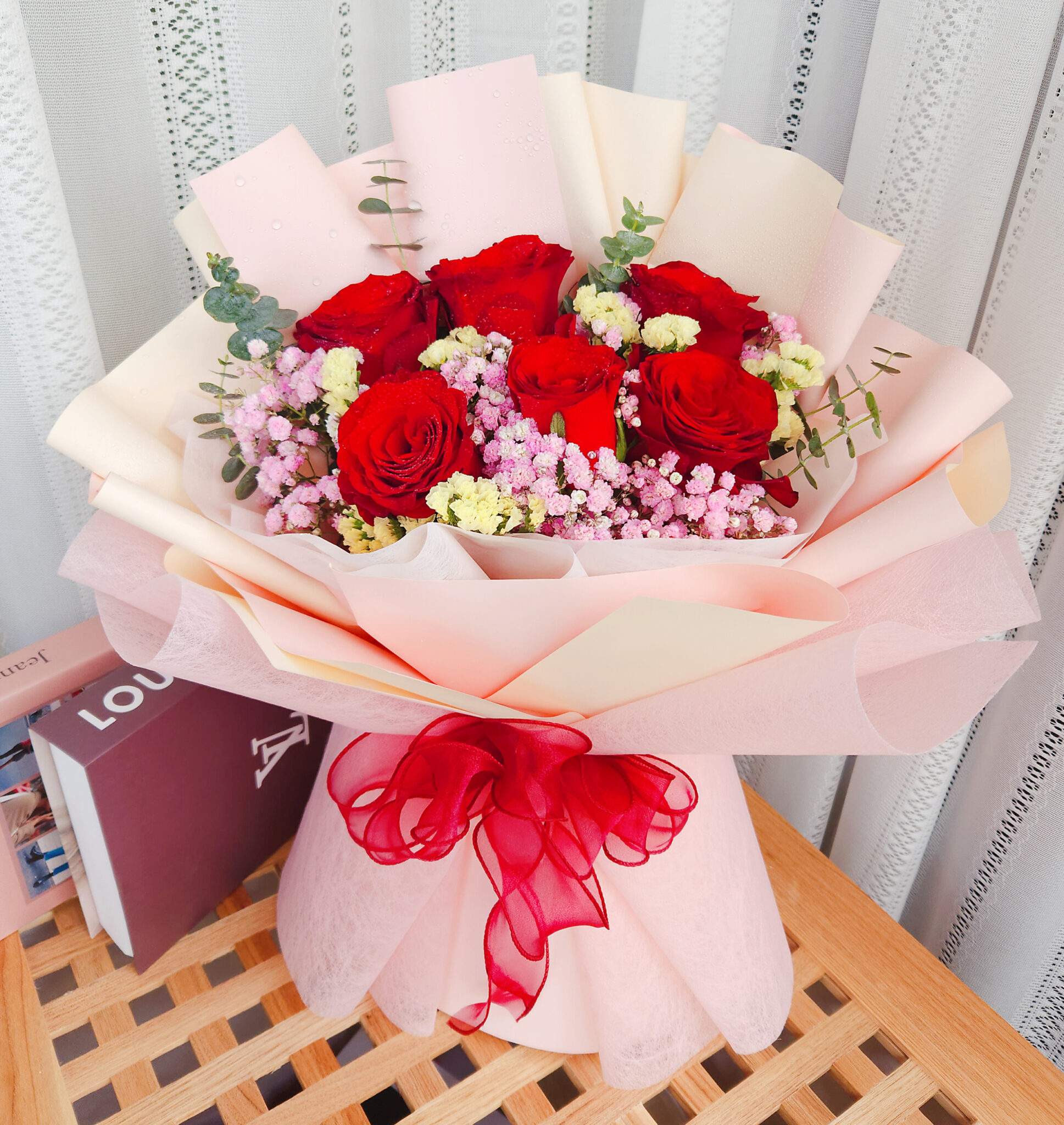 Lovely hand bouquet of 6 Red Roses with decorative Statice.