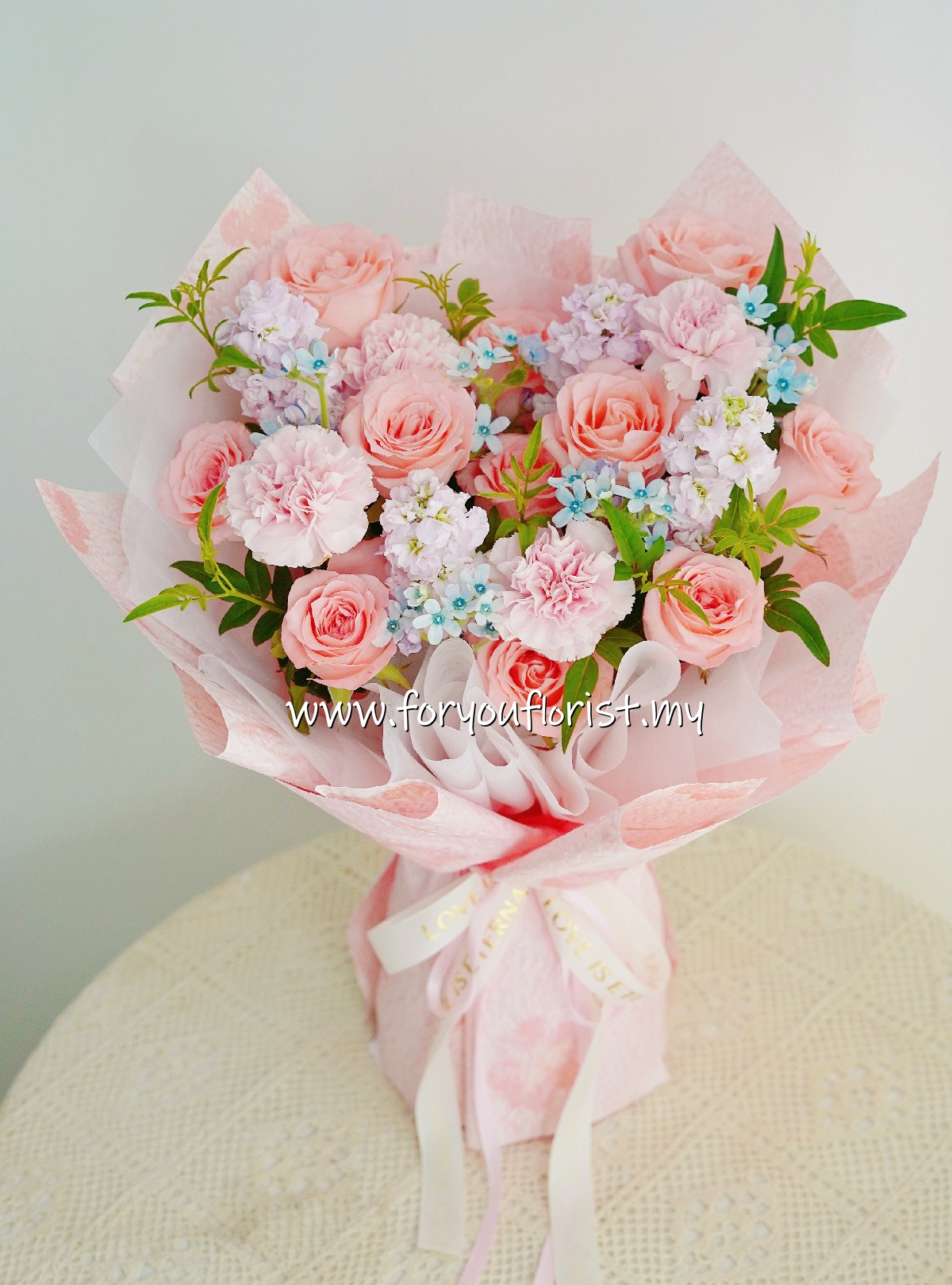 Lovely hand bouquet of 10 pink rose, 3 pink carnations, 4 Mathiola, Blue Star and filler leaf.