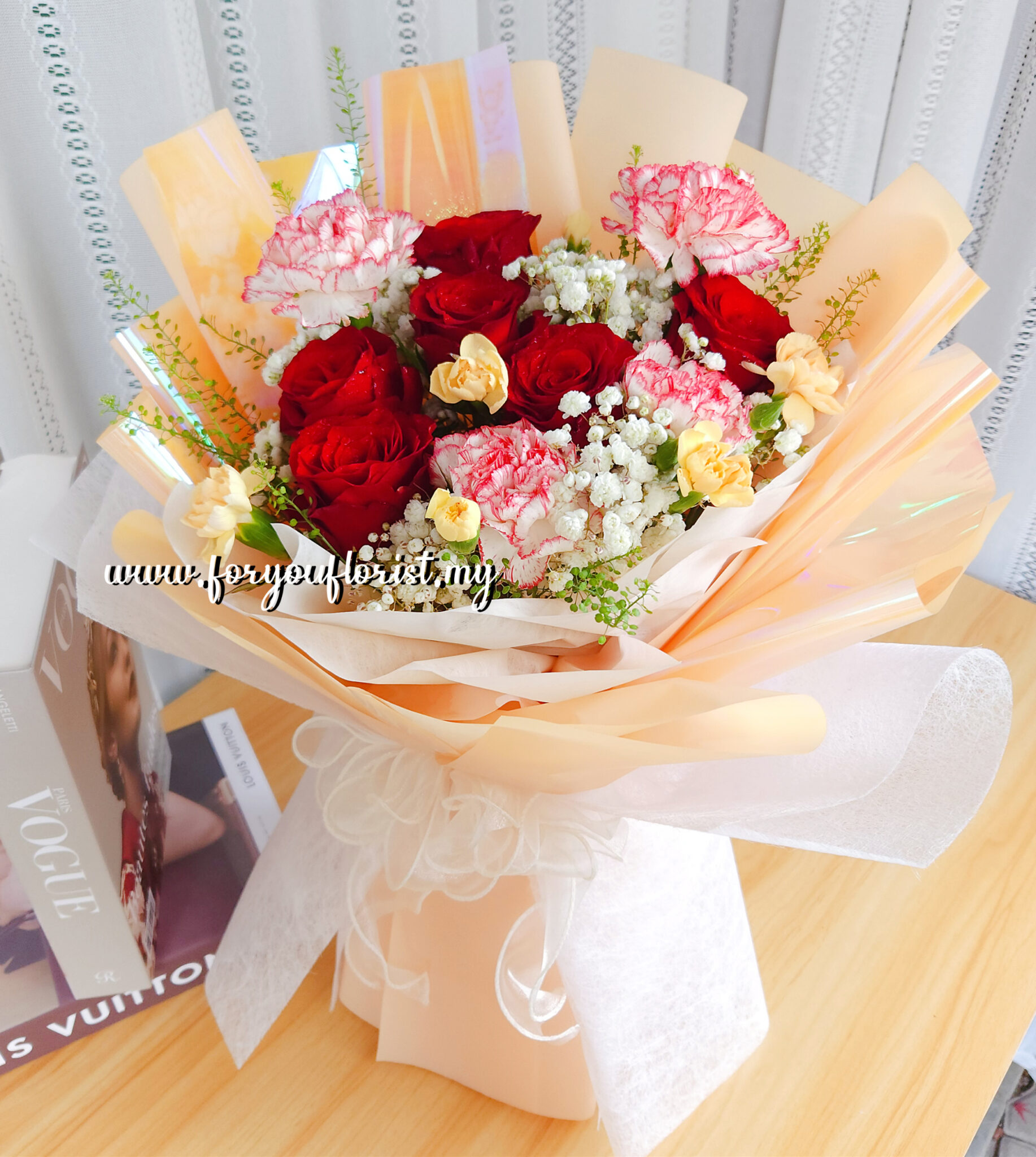 Lovely flower bouquet of 6 Red Roses with yellow Statics and Baby Breath.