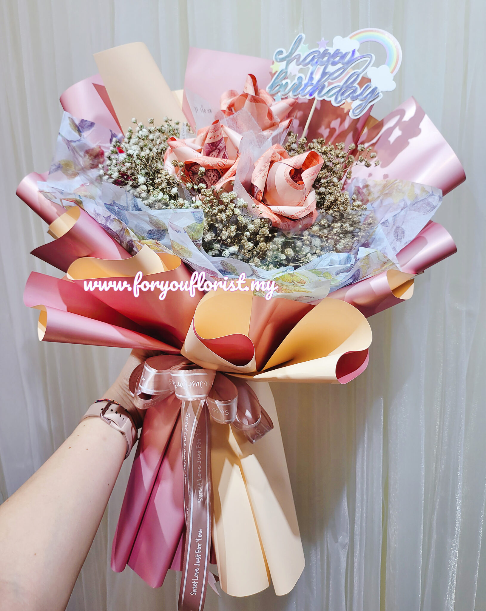 A shimmering hand bouquet wrapping, consist of 3 REAL paper money Roses folded with 12 sheets RM10 Malaysia REAL money notes, surrounded with color sprayed romantic Baby Breath.
