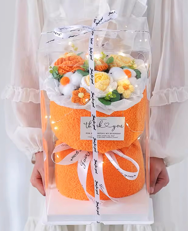 Lovely hand bouquet of Orange and Yellow roses knit produced flower bouquet. Can keep long for remembrance.