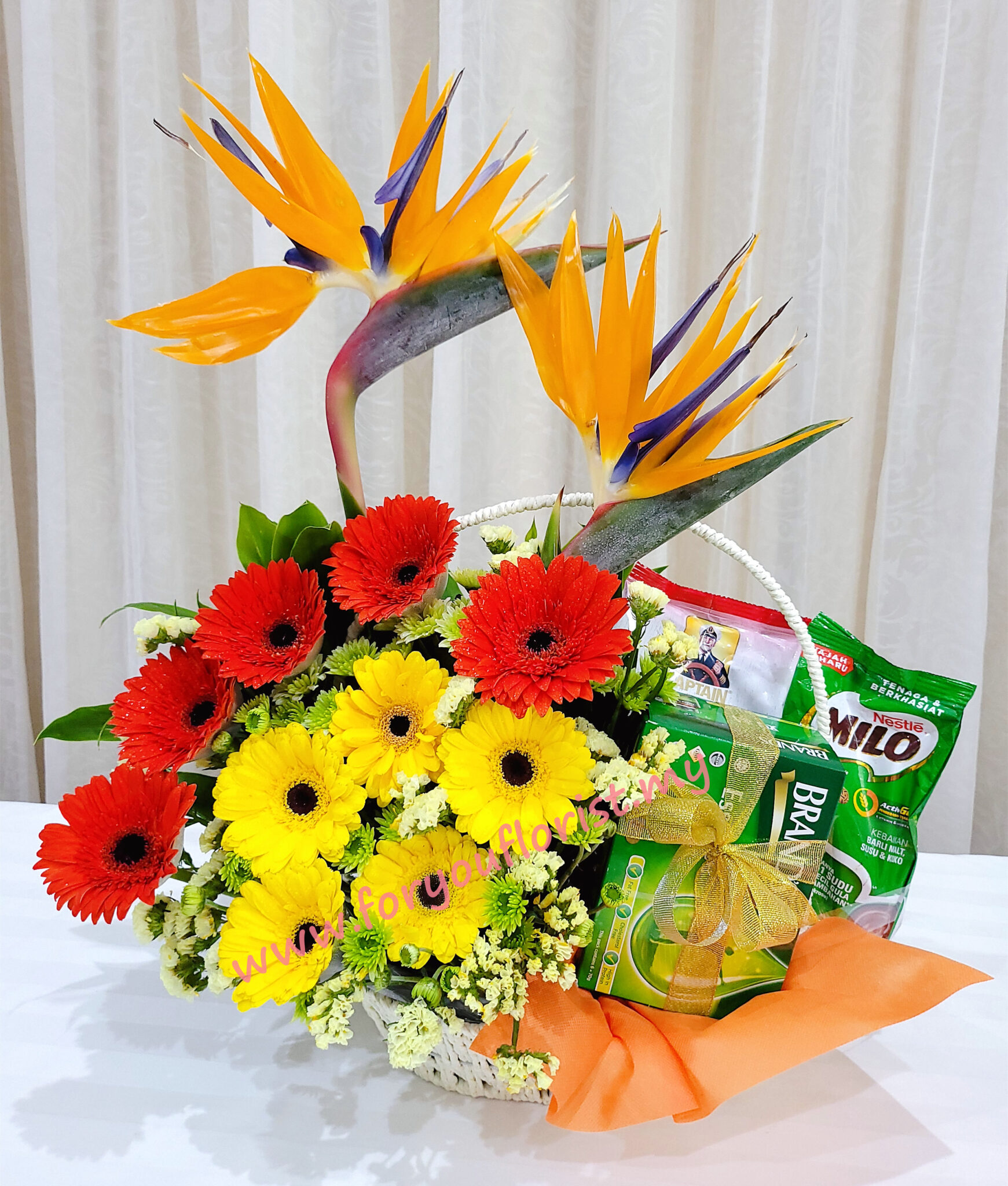 Get well or birthday or anniversary revitalising gift, this basket of Bird Paradise with Orange, Yellow Daisy adn decorative Statics, also consists of BRAND Chicken Essence 6 x 70G, MILO softpack 400G and NESTUM Cerelac 250G.
