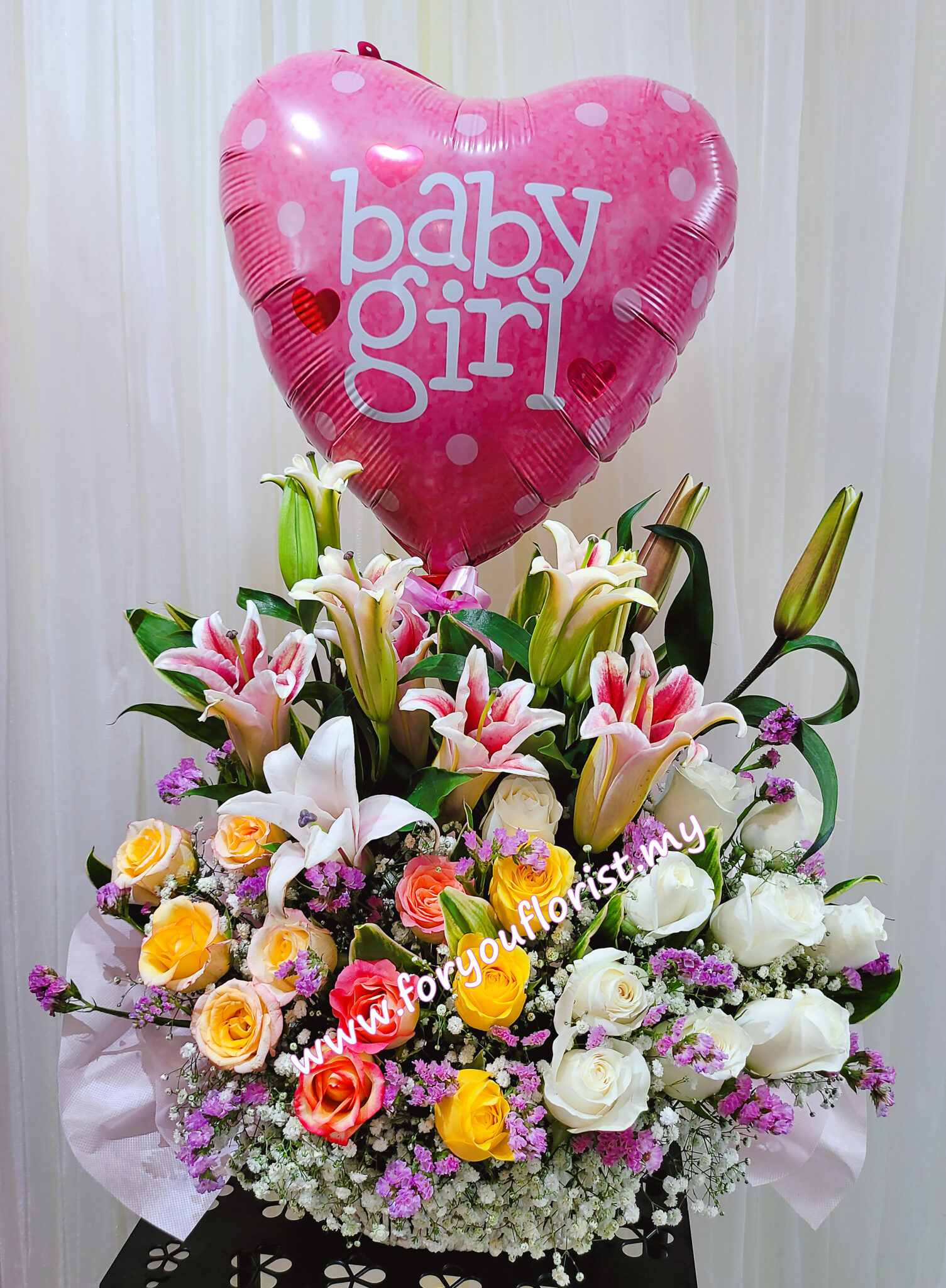 Lovely flower basket of 8 Pink Roses, 12 Champagne Roses with premium Stargazers Lilies, Baby Breath, Greens and a Baby Balloon.