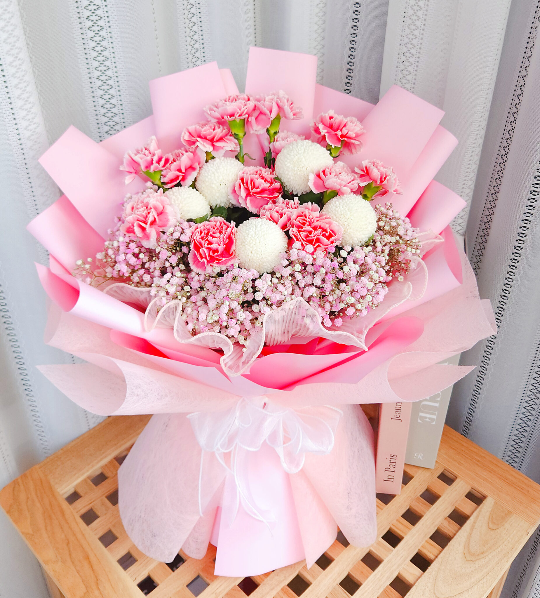 Lovely hand boquuet of 15 Pink Carnations, Pink Baby Breath and 5 white PimPom. Will change to Love stick or Birthday stick based on occasions.