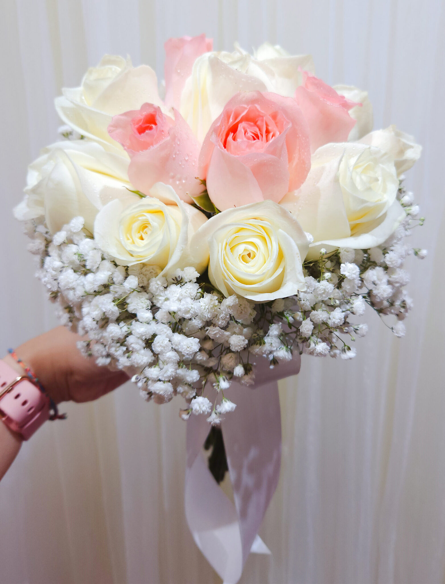Lovely wedding bouquet of 8 White Roses, 5 Pink Roses with premium Baby Breath.