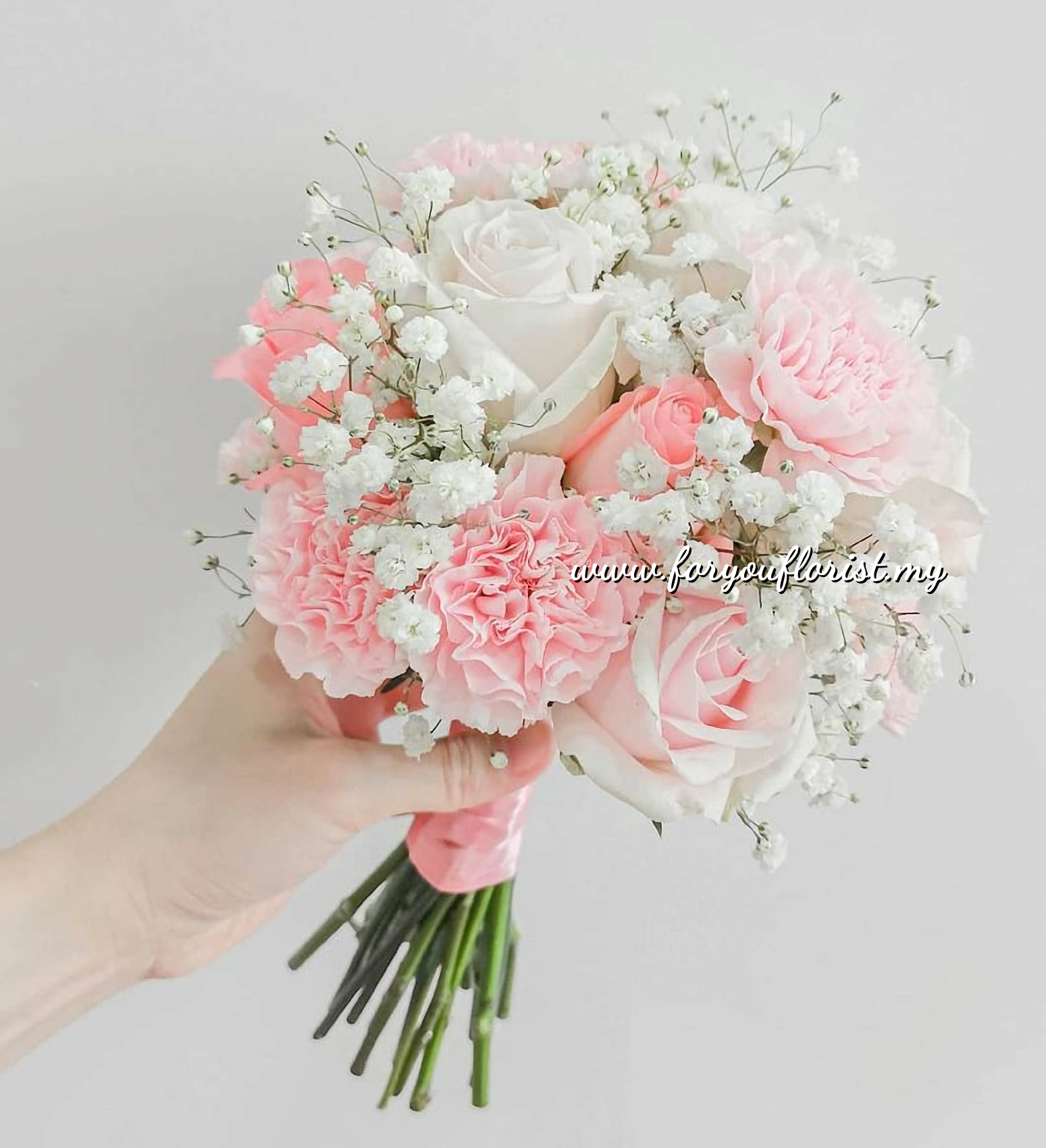 Lovely hand bouquet of 5 Pink Roses, 3 White Roses, 6 pink Carnation with premium Baby Breath.